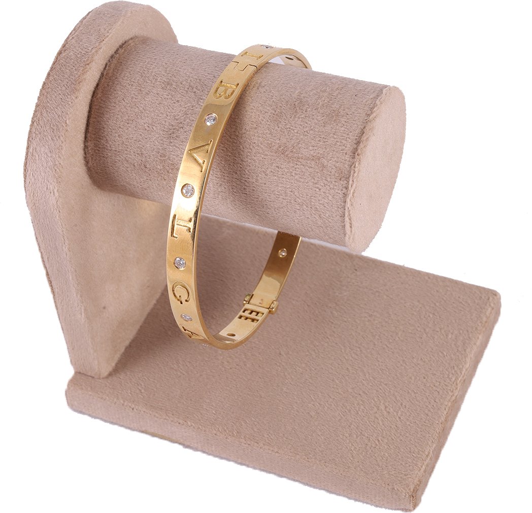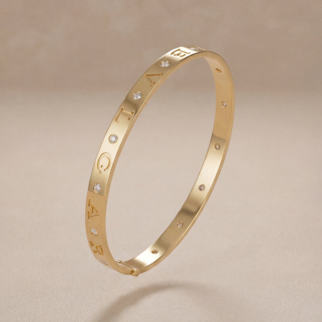 A stylish gold-tone bangle featuring engraved letters and sparkling crystal accents. Designed with a sleek, modern look, this bracelet adds a touch of elegance to any outfit—perfect for everyday wear or special occasions. Durable, lightweight, and comfortable for all-day style