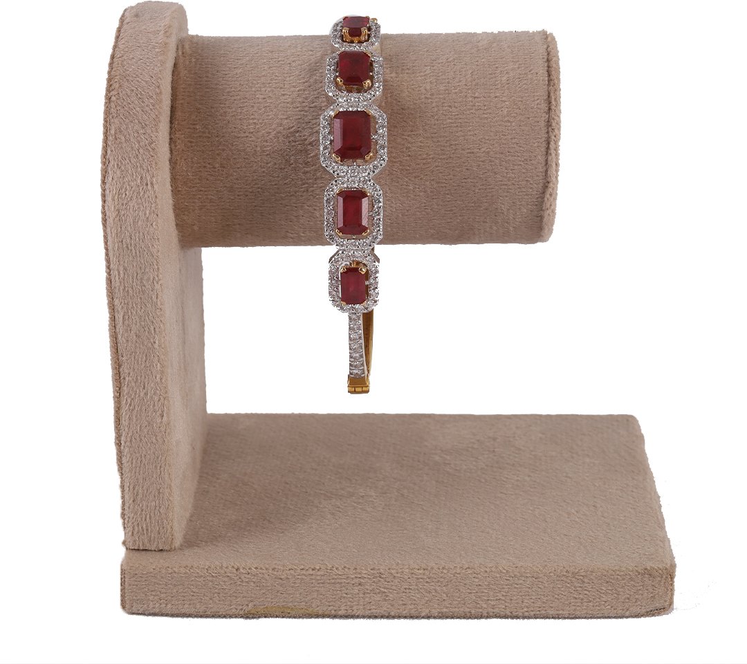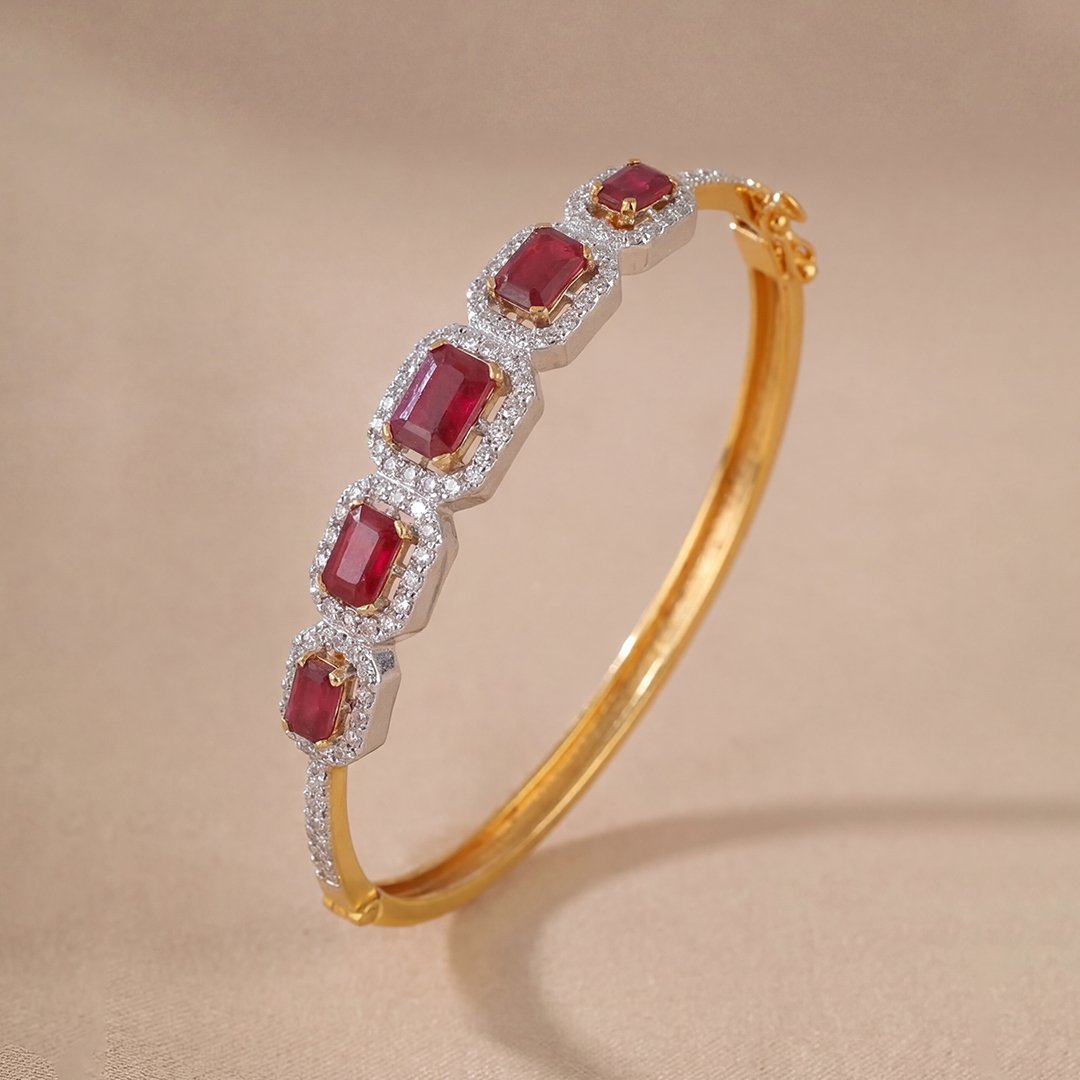 This regal two-tone statement piece features five magnificent emerald-cut rubies in a graduated arrangement. Each deep-red gemstone is encased in a shimmering halo of white pavé accents, set against a brilliant silver-tone face. The contrast with the polished gold-tone band creates a truly majestic look.