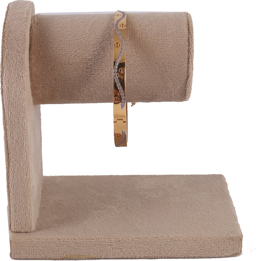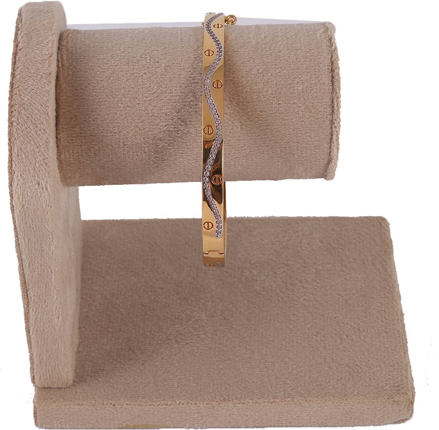 This sleek, modern bangle features a unique faceted diamond-shape profile in a radiant gold finish. The design is punctuated by circular screw-head motifs, offering a contemporary industrial-chic aesthetic. Its sharp lines and high-polish surface reflect light beautifully, making it a standout minimalist piece.