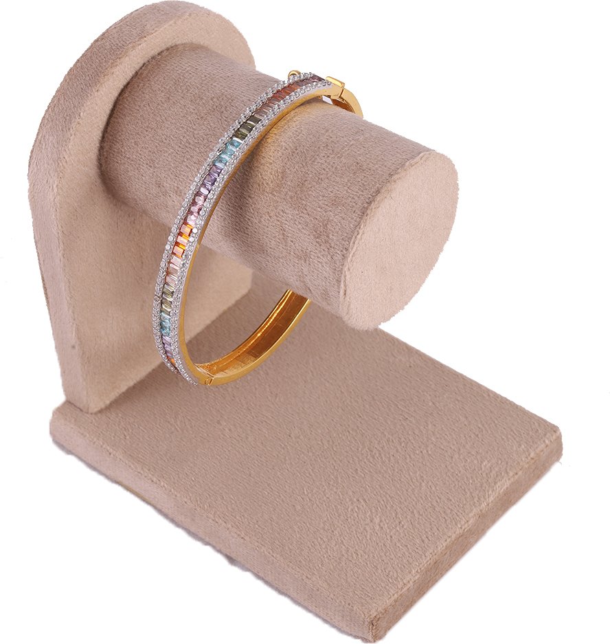 A spectrum of style. This stunning bangle features a channel-set row of multi-colored baguette gemstones, framed by two shimmering rows of pavé-set accents. With its radiant “rainbow” effect and luxurious gold-tone finish, it’s the ultimate statement piece for those who love bold, colorful luxury.