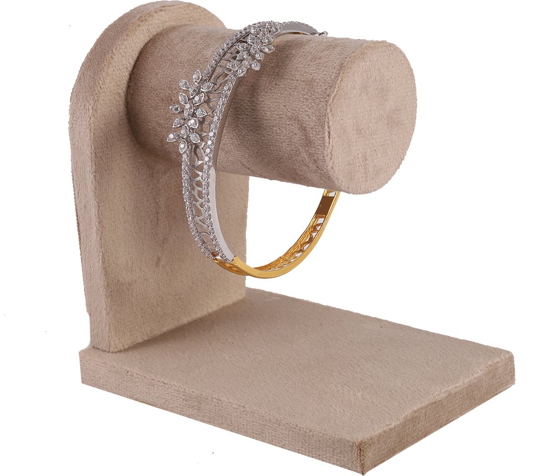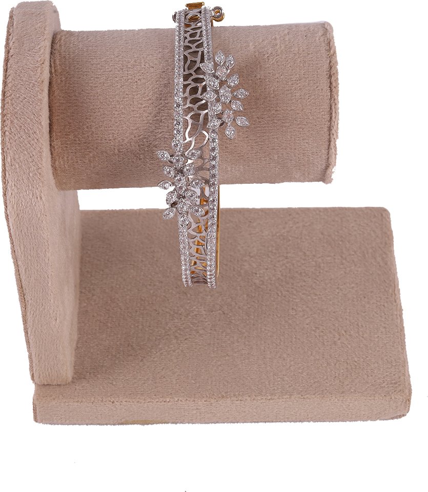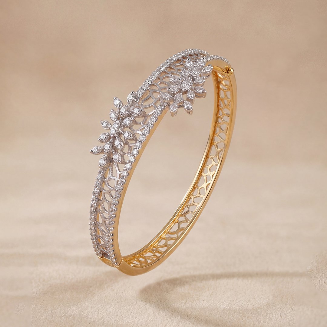 This stunning two-tone bangle features a romantic, nature-inspired design. It showcases two shimmering floral clusters that meet in an elegant bypass style, set against an intricate gold-tone filigree background. The borders are lined with brilliant white pavé accents, adding a layer of continuous sparkle.