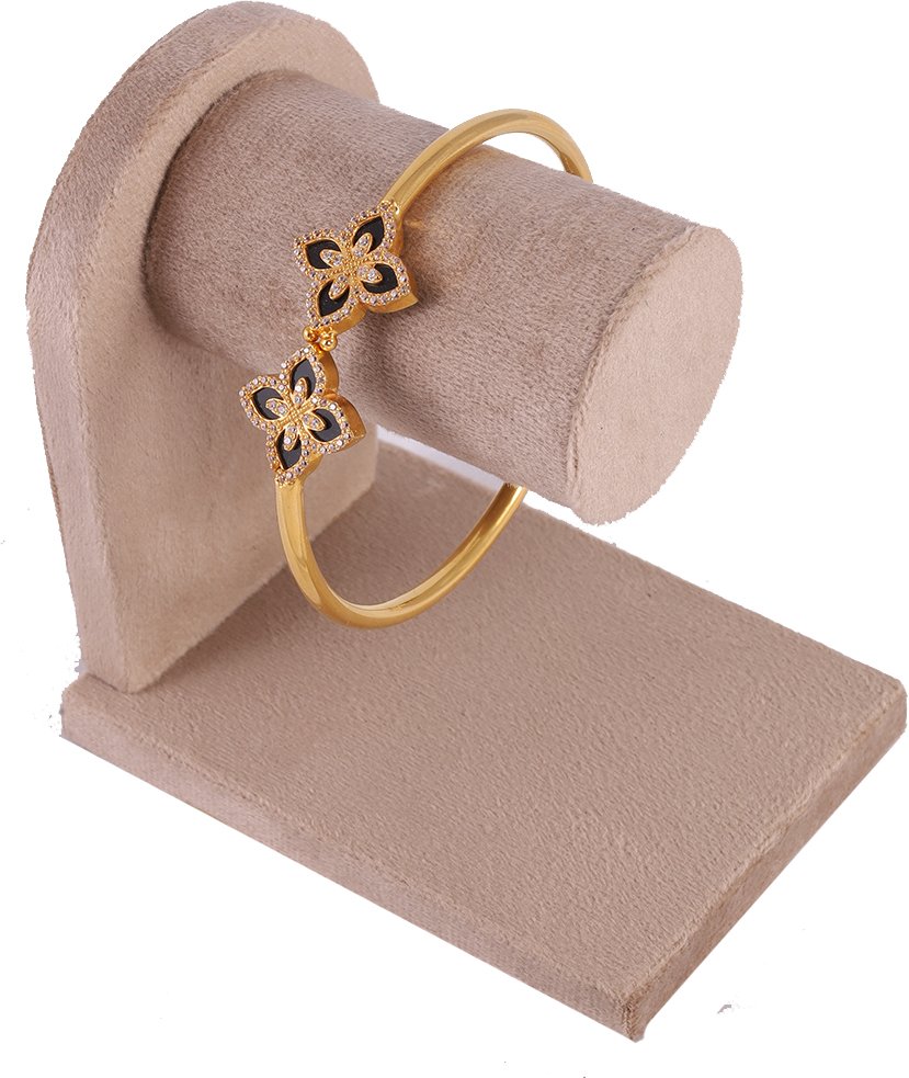 This chic, modern bangle features a striking dual quatrefoil design. Each floral motif is inlaid with deep black onyx-style enamel, bordered by a halo of shimmering white pavé accents. The contrast between the dark centers and the brilliant stones creates a bold, high-fashion aesthetic.