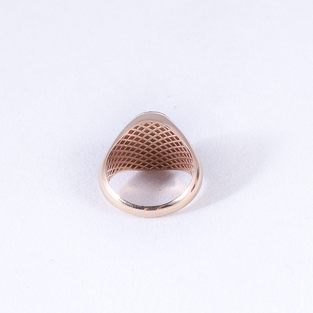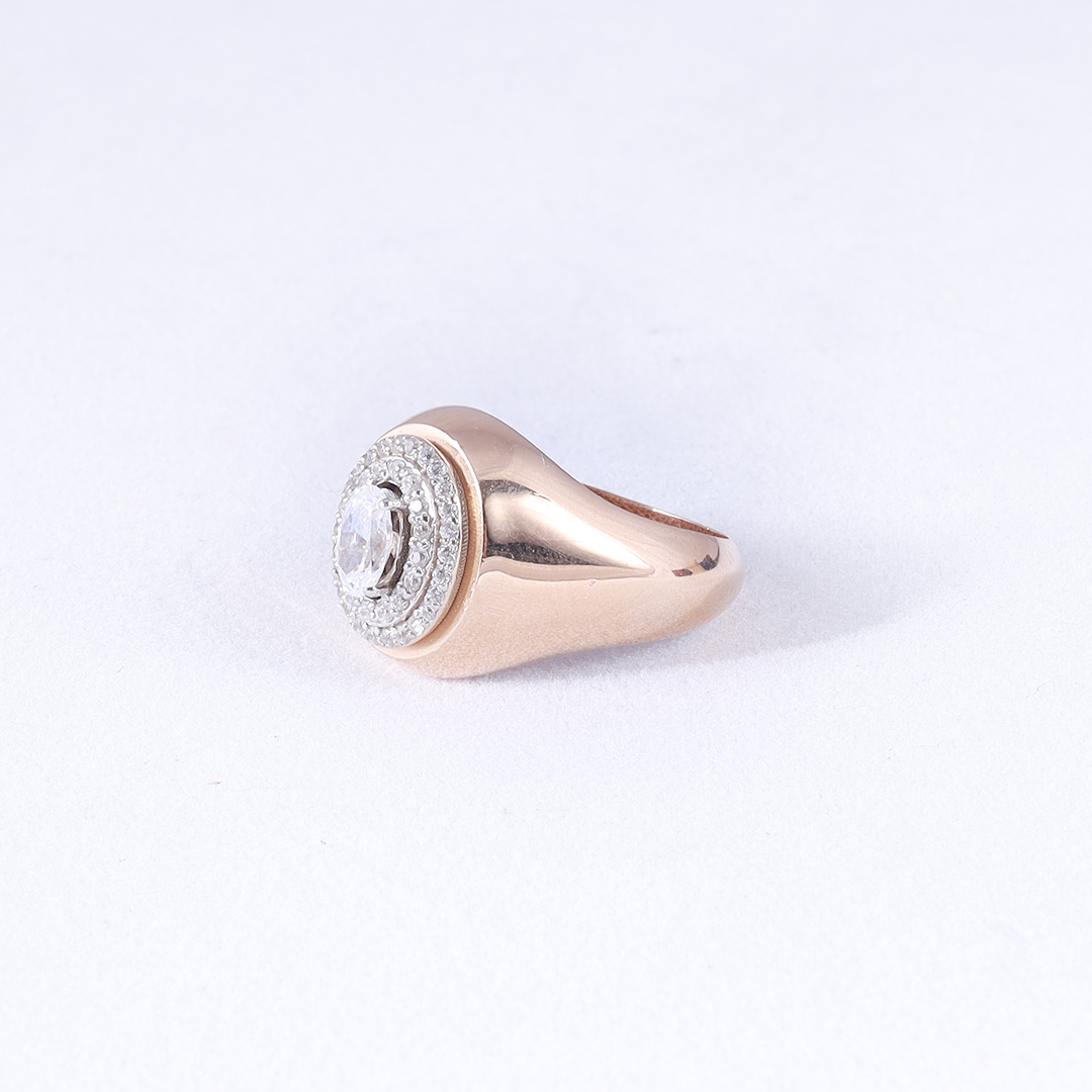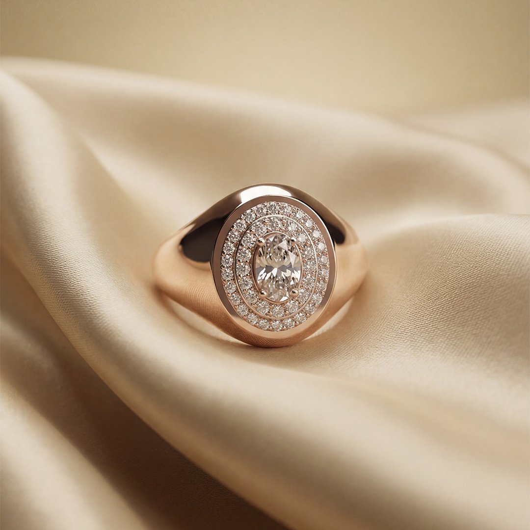 This piece is a polished gold signet-style ring with a refined, sparkling center.A central oval-cut diamond (or gemstone) surrounded by a double pavé halo of smaller round diamonds.Classic and elegant, combining the masculine silhouette of a signet ring with feminine brilliance.