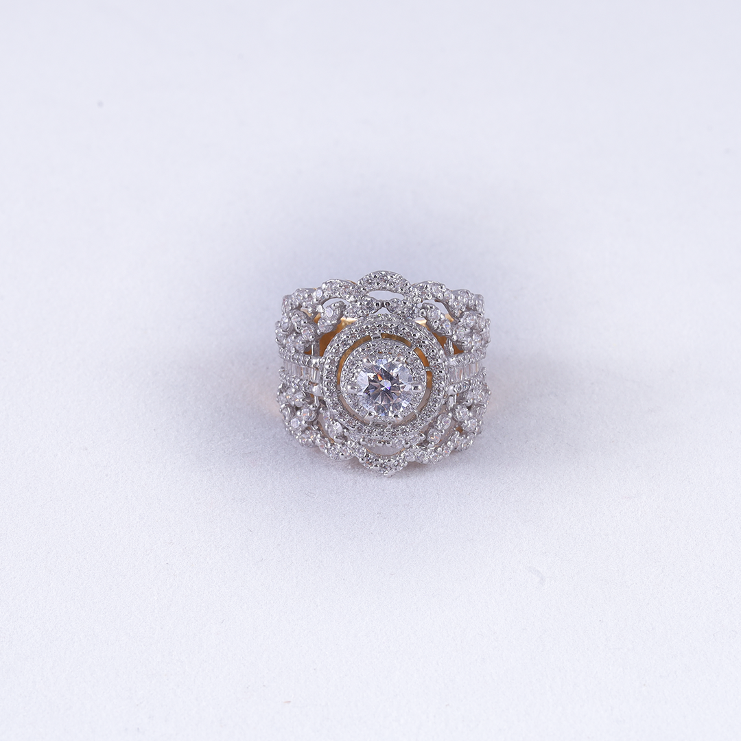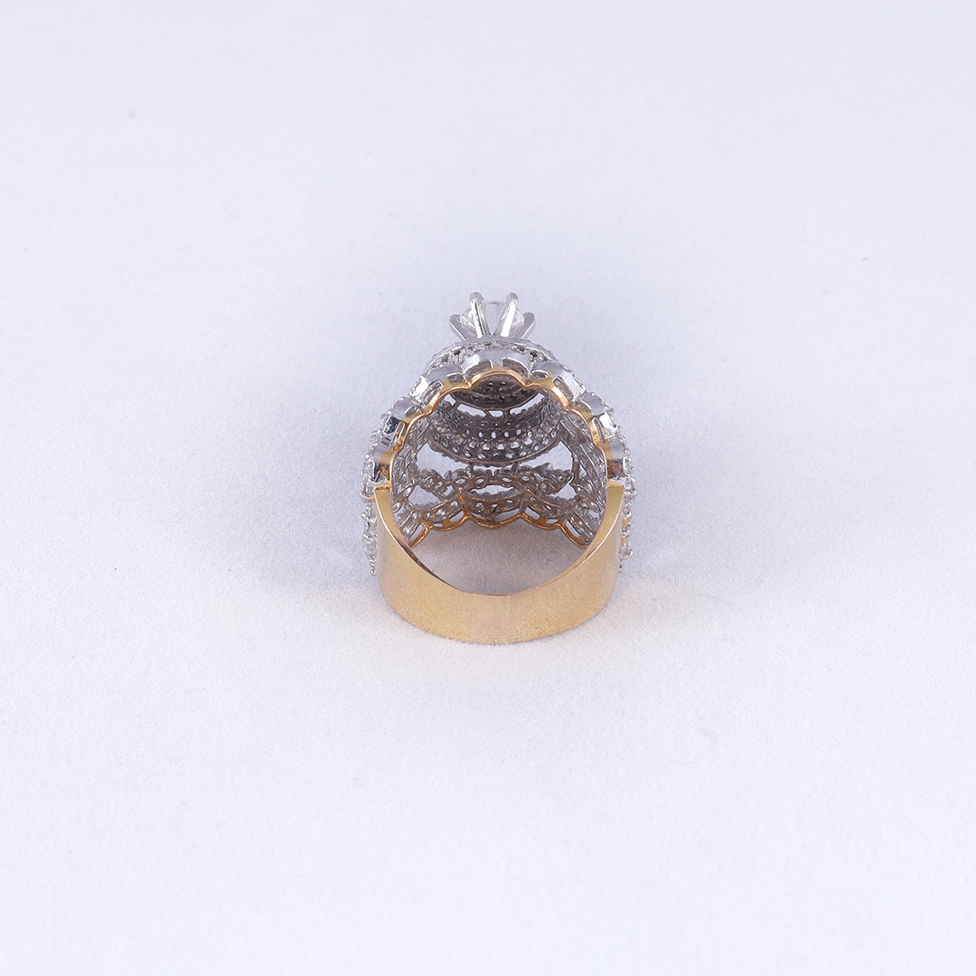 The band transitions into an elaborate, openwork filigree gallery with scalloped edges and floral-like patterns.The ring utilizes a combination of pavé and channel settings to cover almost every visible surface with stones, creating a “halo” effect across multiple levels.