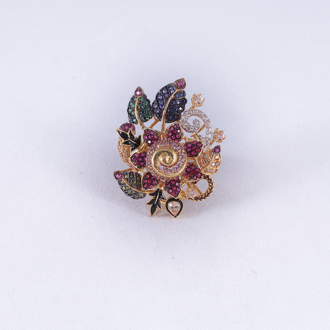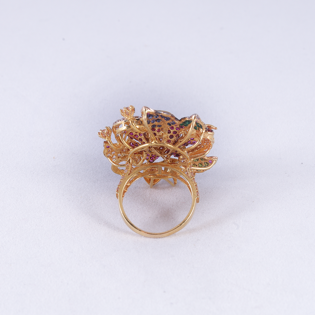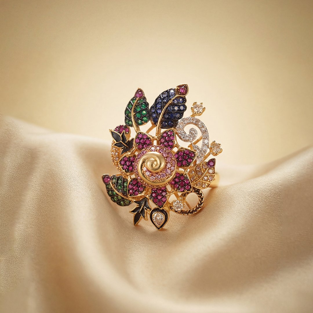 This is an intricate, floral-themed gold ring featuring a vibrant “garden” design.An ornate, multi-layered flower with a textured gold spiral cente. Embellished with colorful pavé-set stones including ruby red, emerald green, and sapphire blue.
