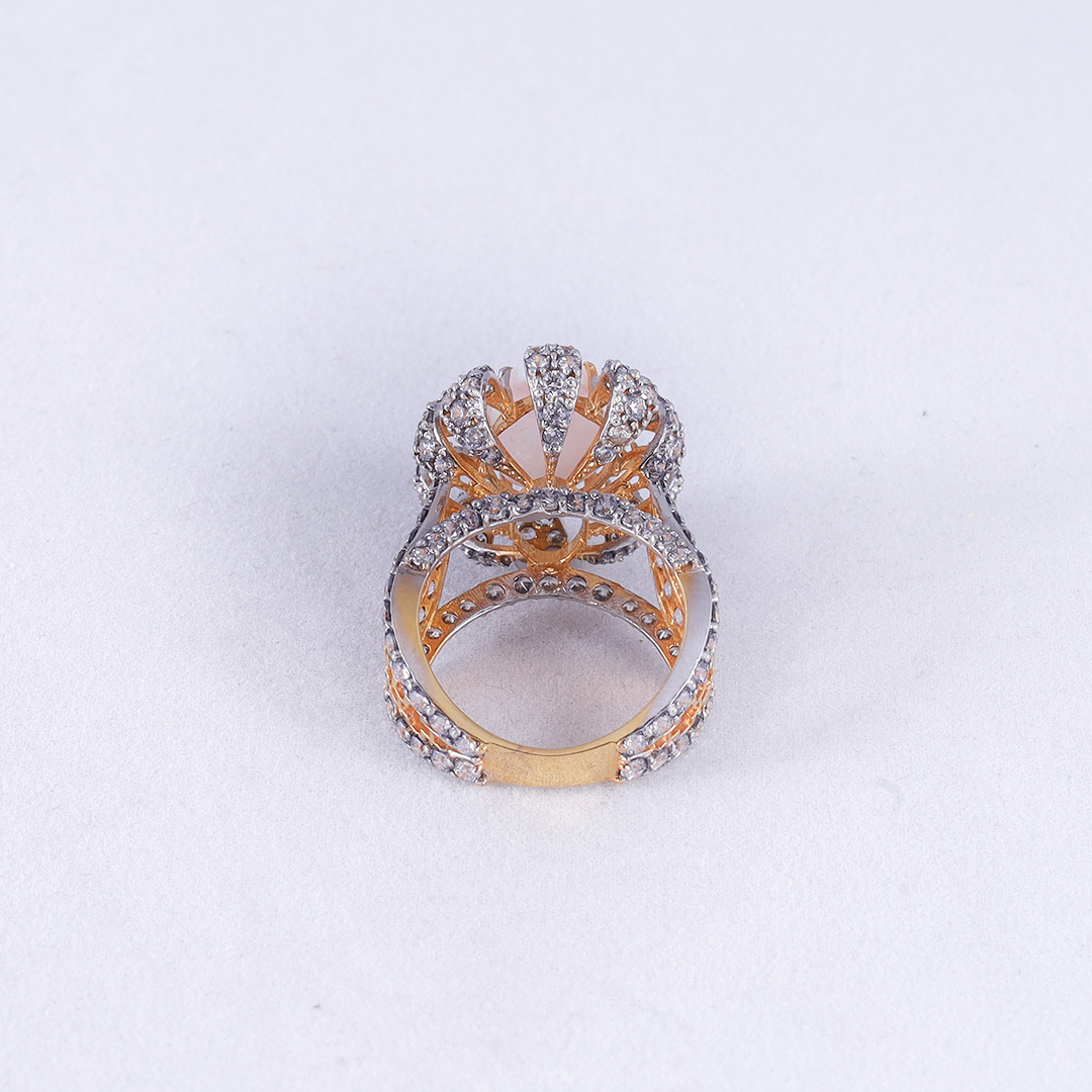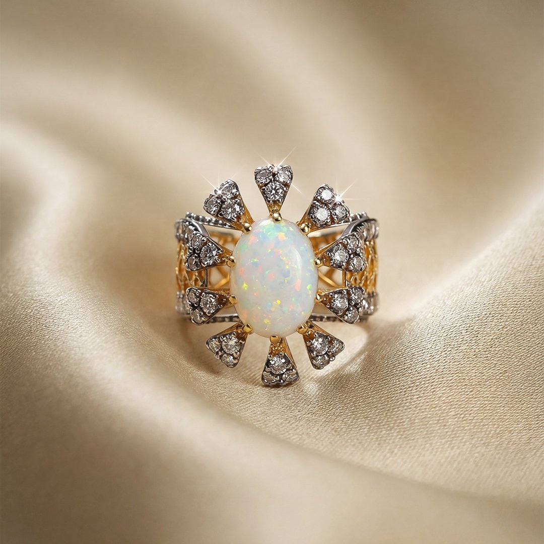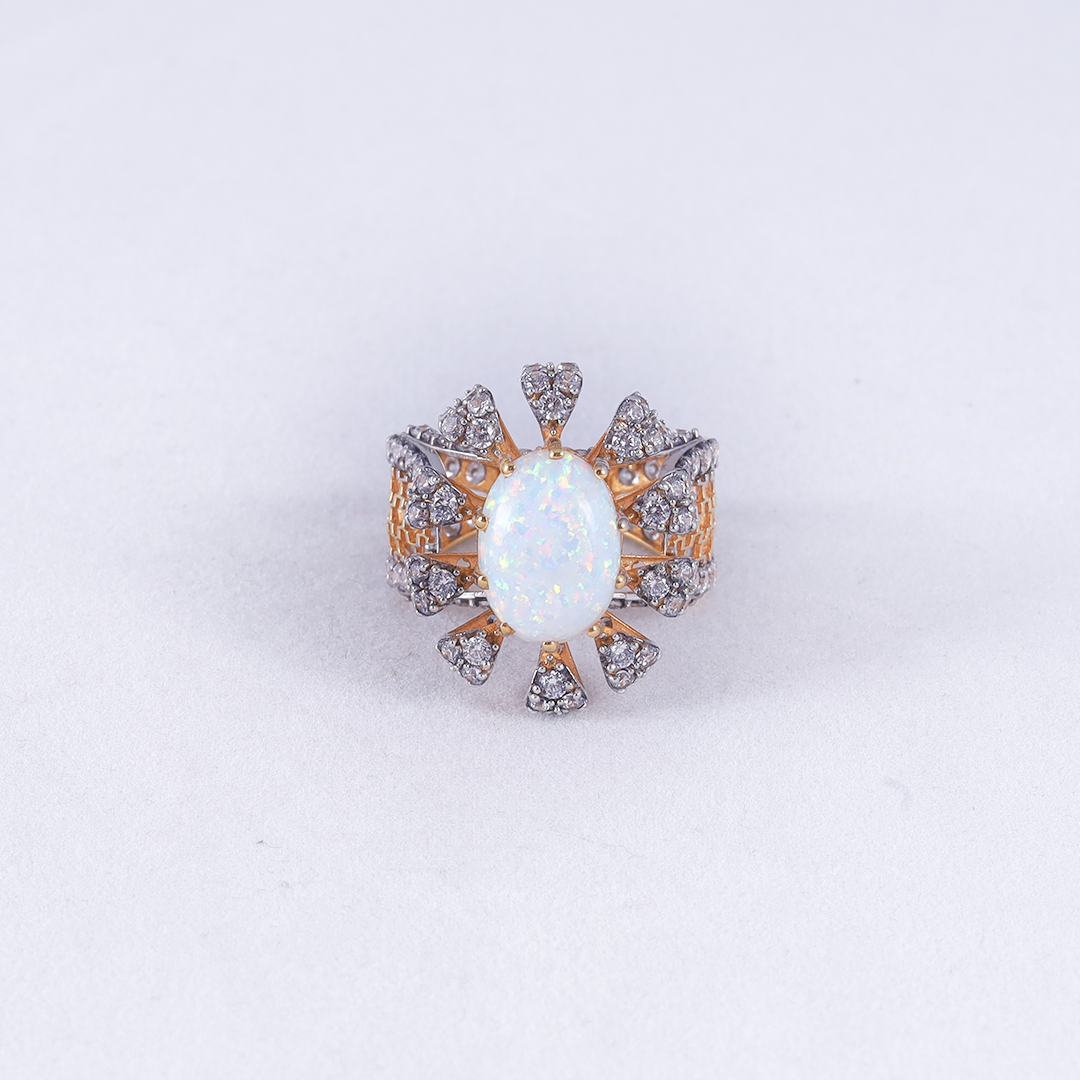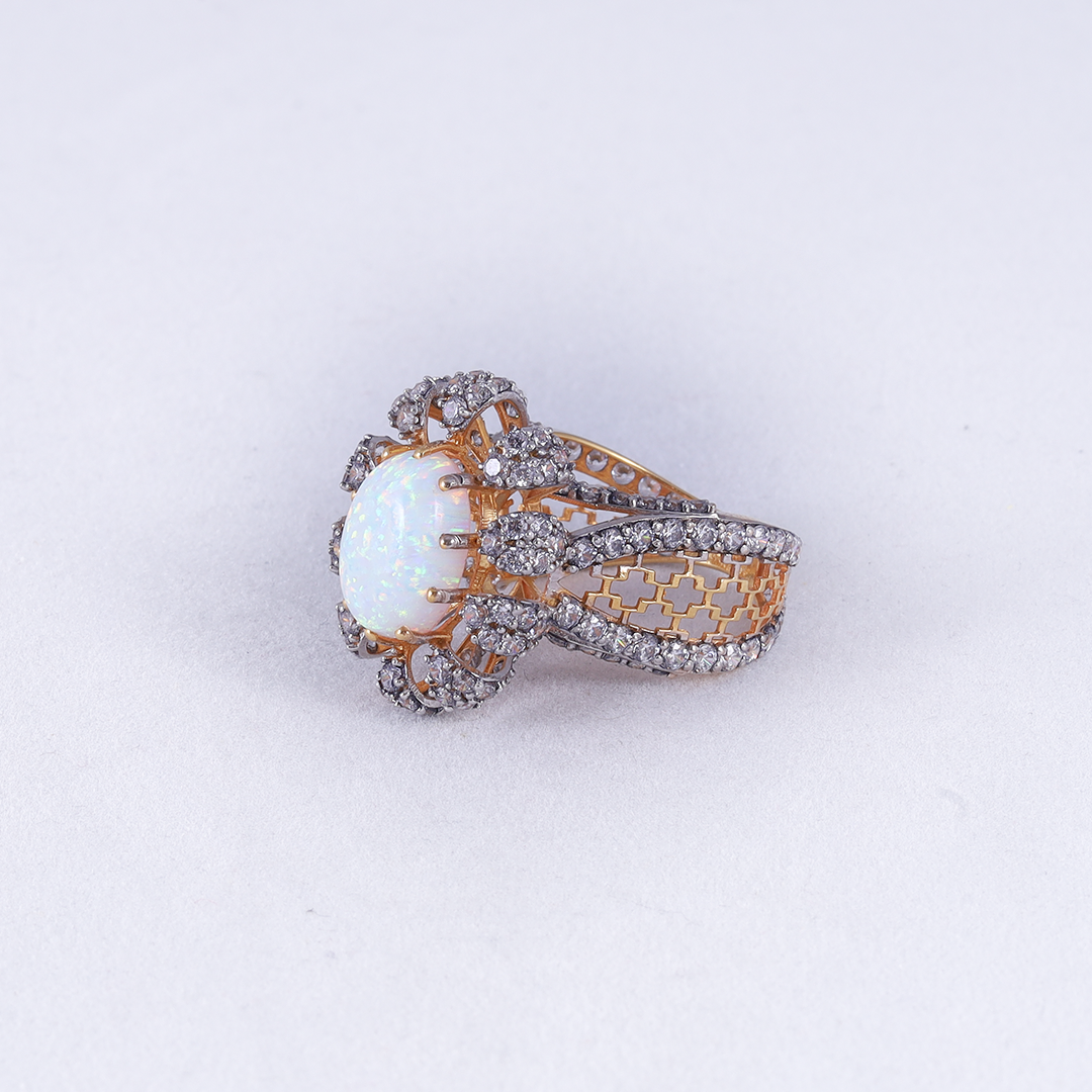 A large, oval-cut white opal with iridescent flashes of pink, green, and gold..the opal is surrounded by a scalloped, floral-inspired halo set with sparkling clear stones.The edges of the band and the floral clusters are lined with brilliant clear stones for maximum shine.
