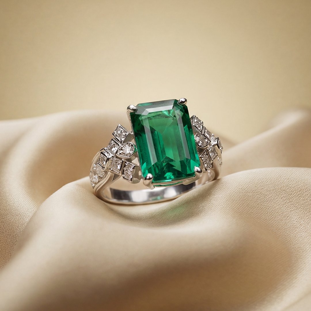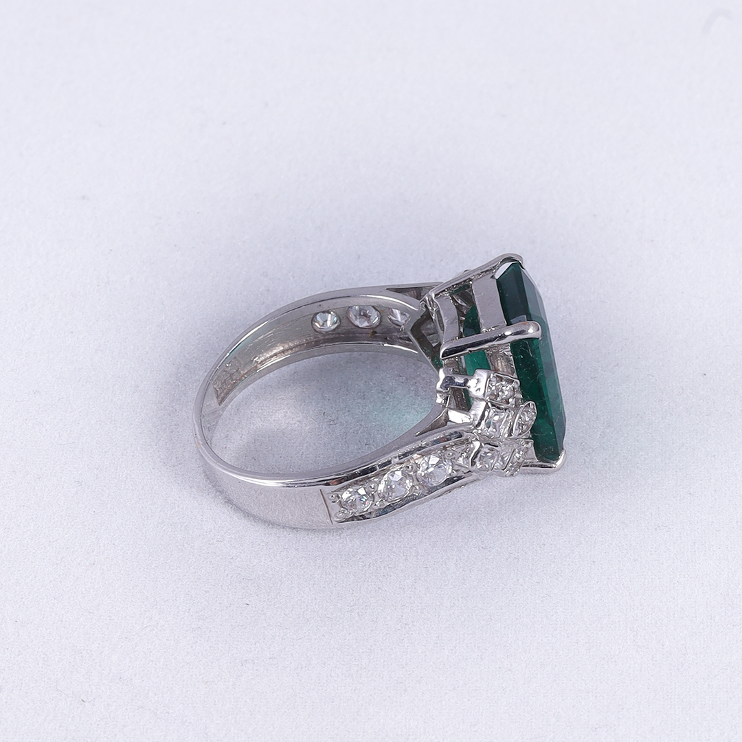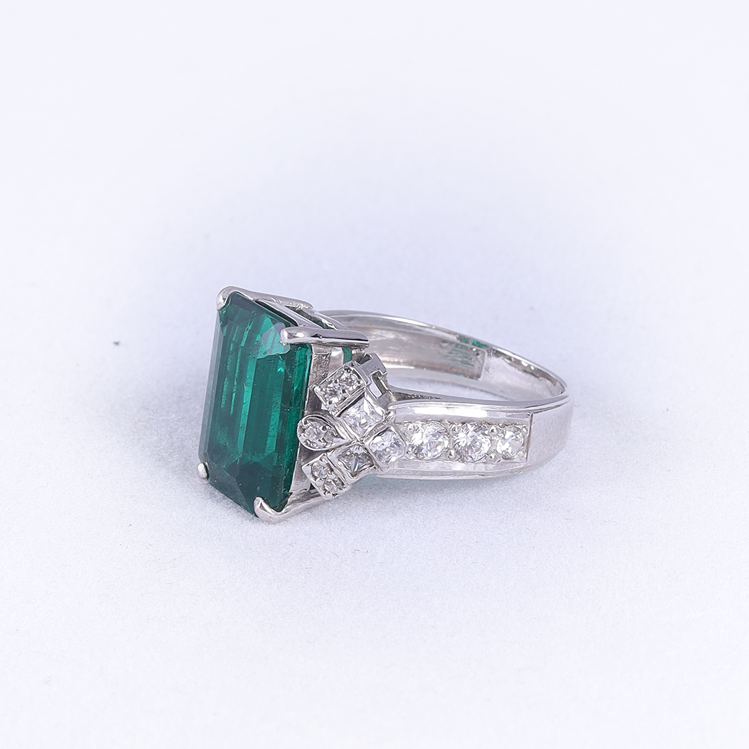 Gorgeous Green Zircon Statement Ring. Features a large emerald-cut center stone with brilliant side accents. Elegant, timeless, and budget-friendly luxury