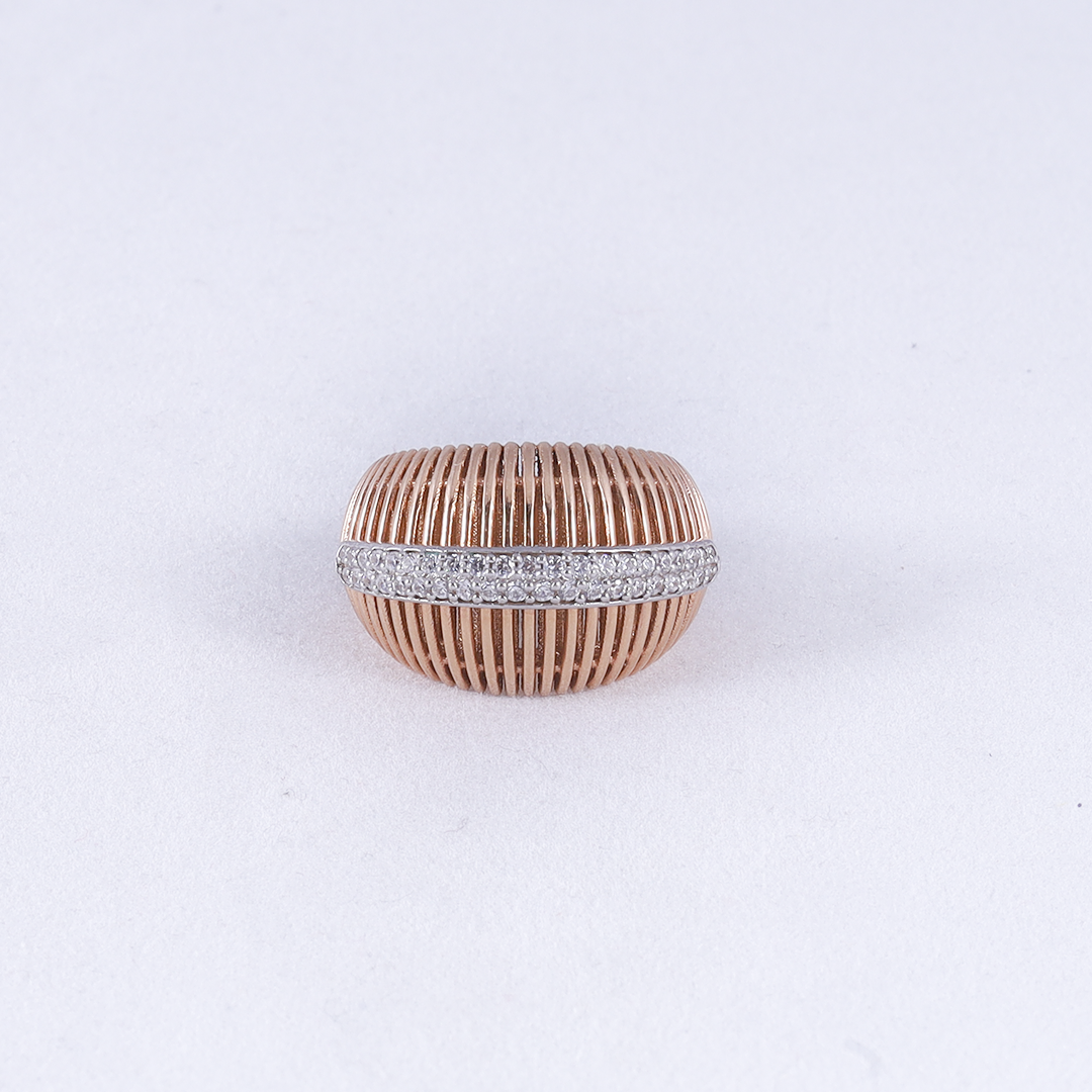 This bold statement piece features a striking ribbed “cigar” silhouette in polished gold, elegantly bisected by a horizontal band of pavé-set zircon for a sophisticated, modern-industrial look.