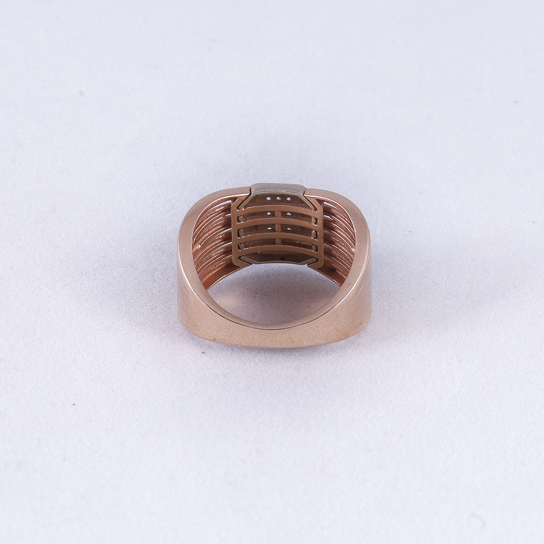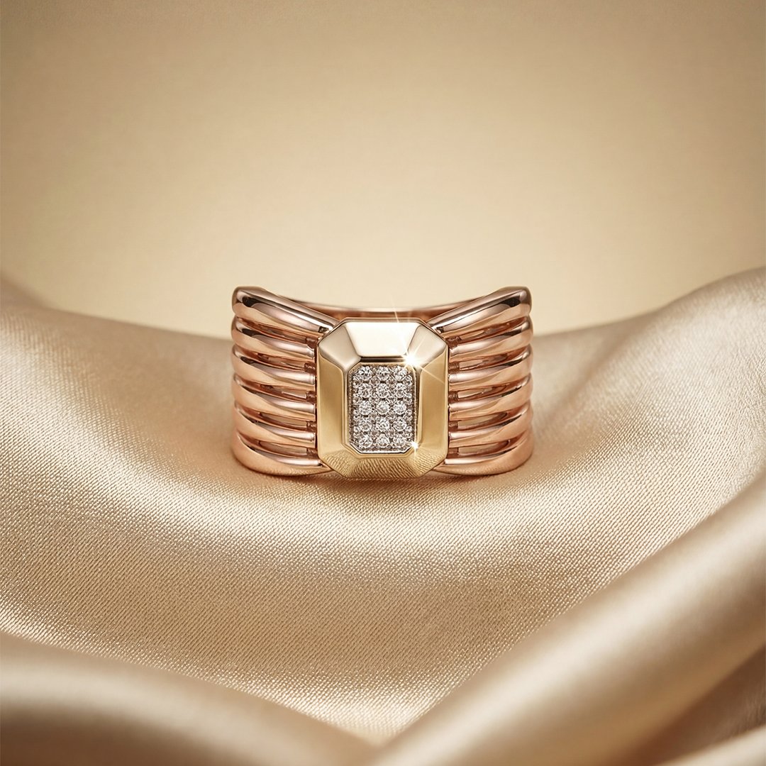 A sophisticated gold band with open-work fluted sides meets at a central octagonal gold plate, which is inlaid with a refined cluster of pavé-set zircon.