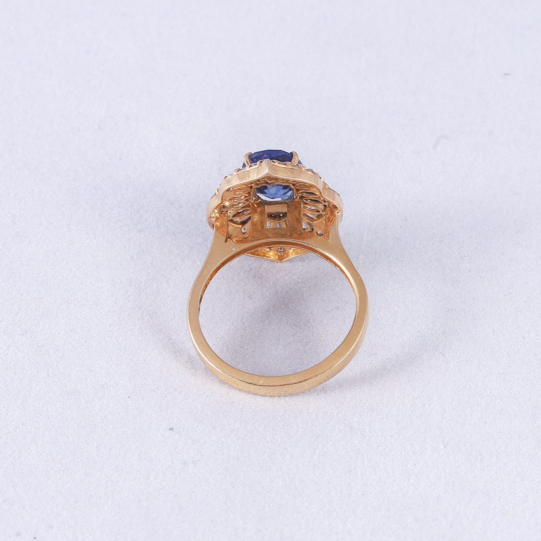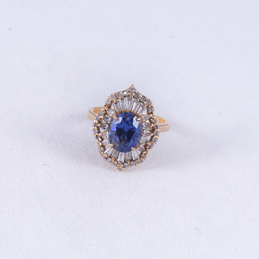A vibrant oval-cut blue sapphire is encased in a dramatic sunburst halo of baguette and round-cut zirons ,creating a sophisticated, vintage-inspired silhouette.
