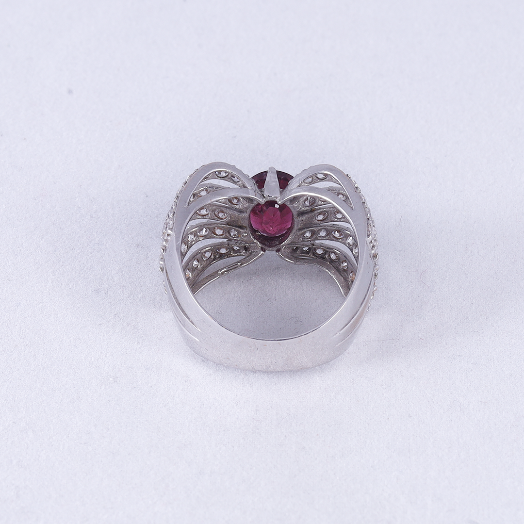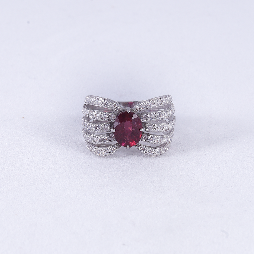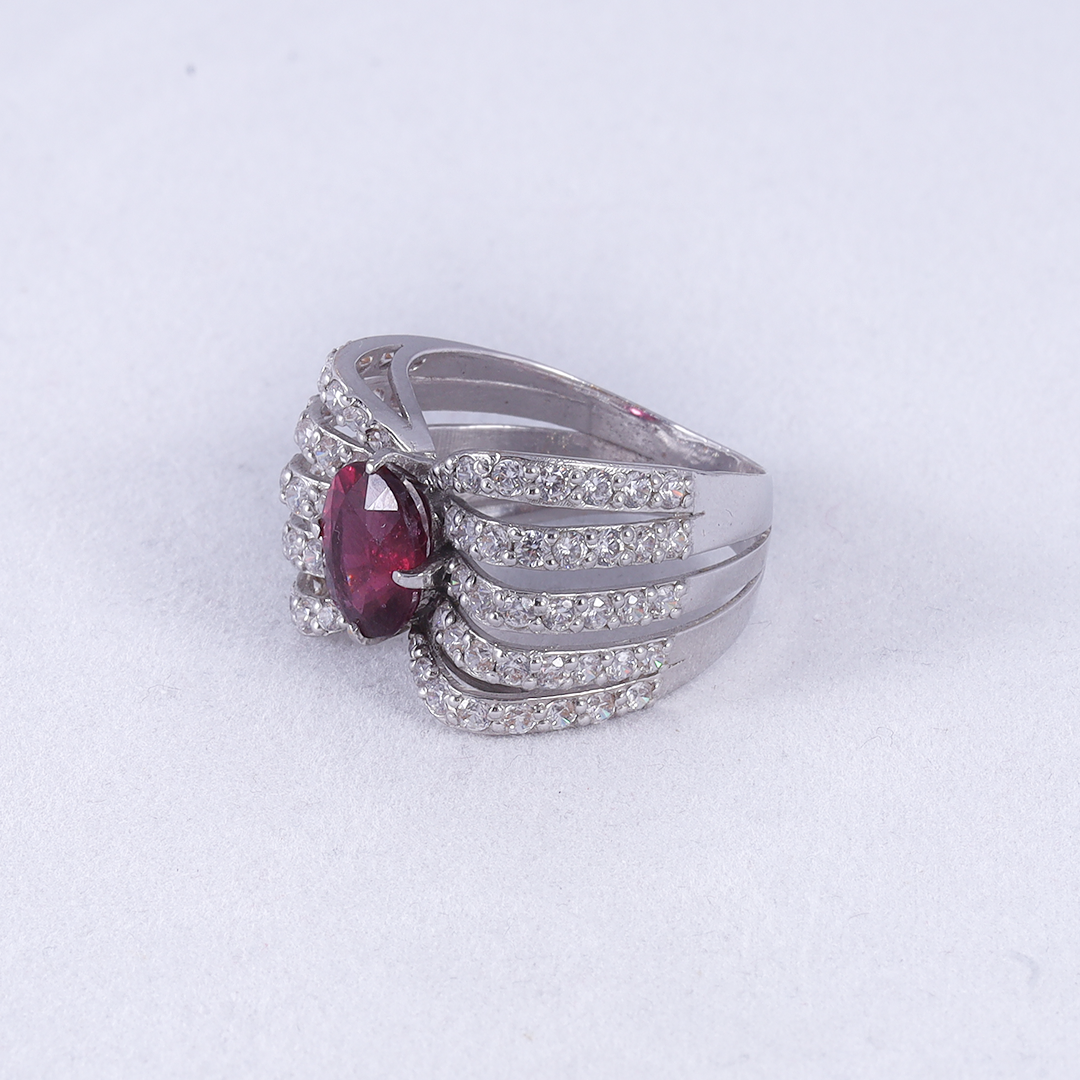 A striking oval-cut ruby is centered within an intricate, wide-band lattice of silver-toned metal heavily encrusted with shimmering pavé-set zircons that flare outward in a series of elegant, scalloped curves.