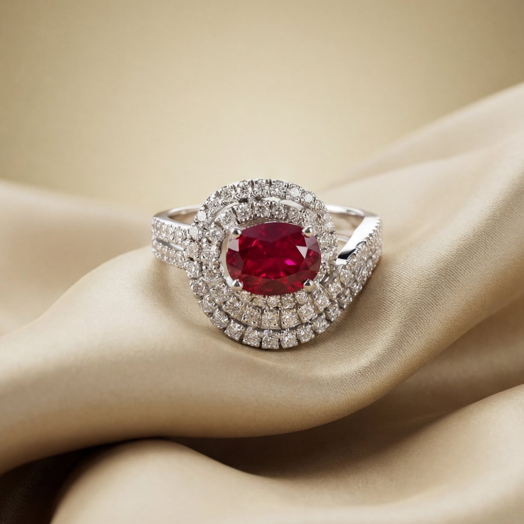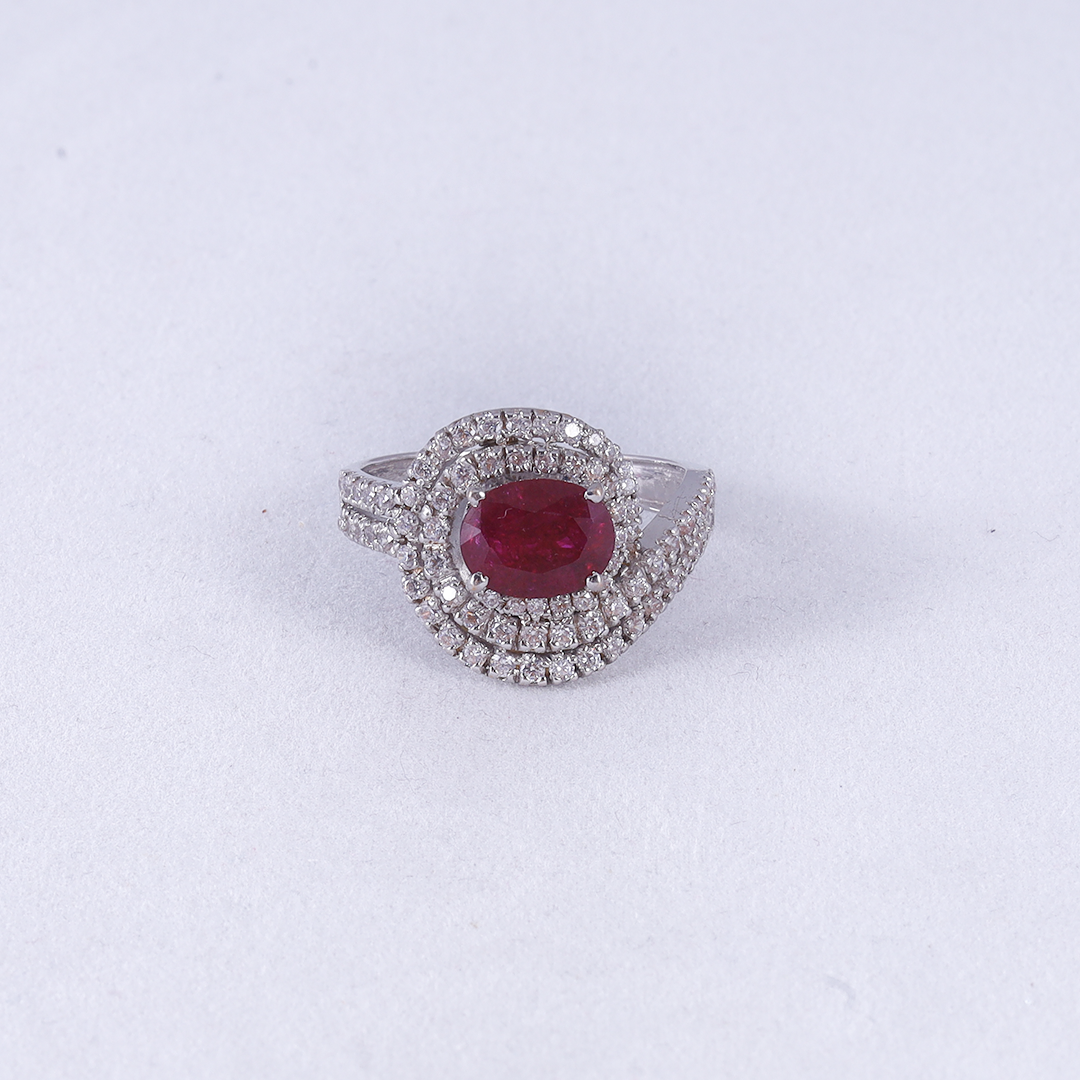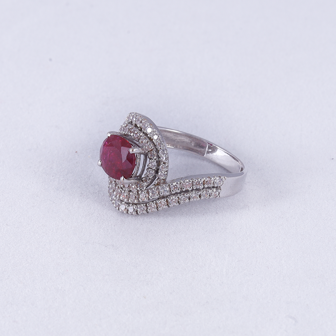 An exquisite oval-cut ruby is cradled within a flowing bypass setting of shimmering pavé-set zircon that wrap around the finger in a graceful, interlocking design.