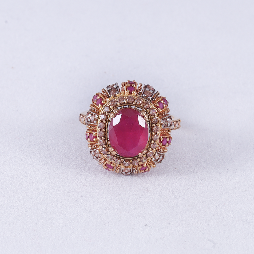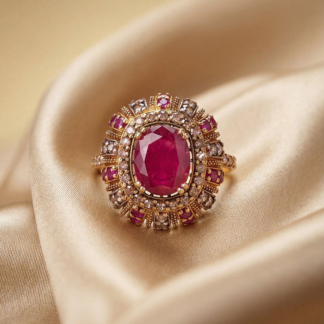 This ornate gold cocktail ring features a vibrant oval-cut ruby centerpiece surrounded by an intricate, dual-layered sunburst halo of delicate gold filigree and small, accent rubies.