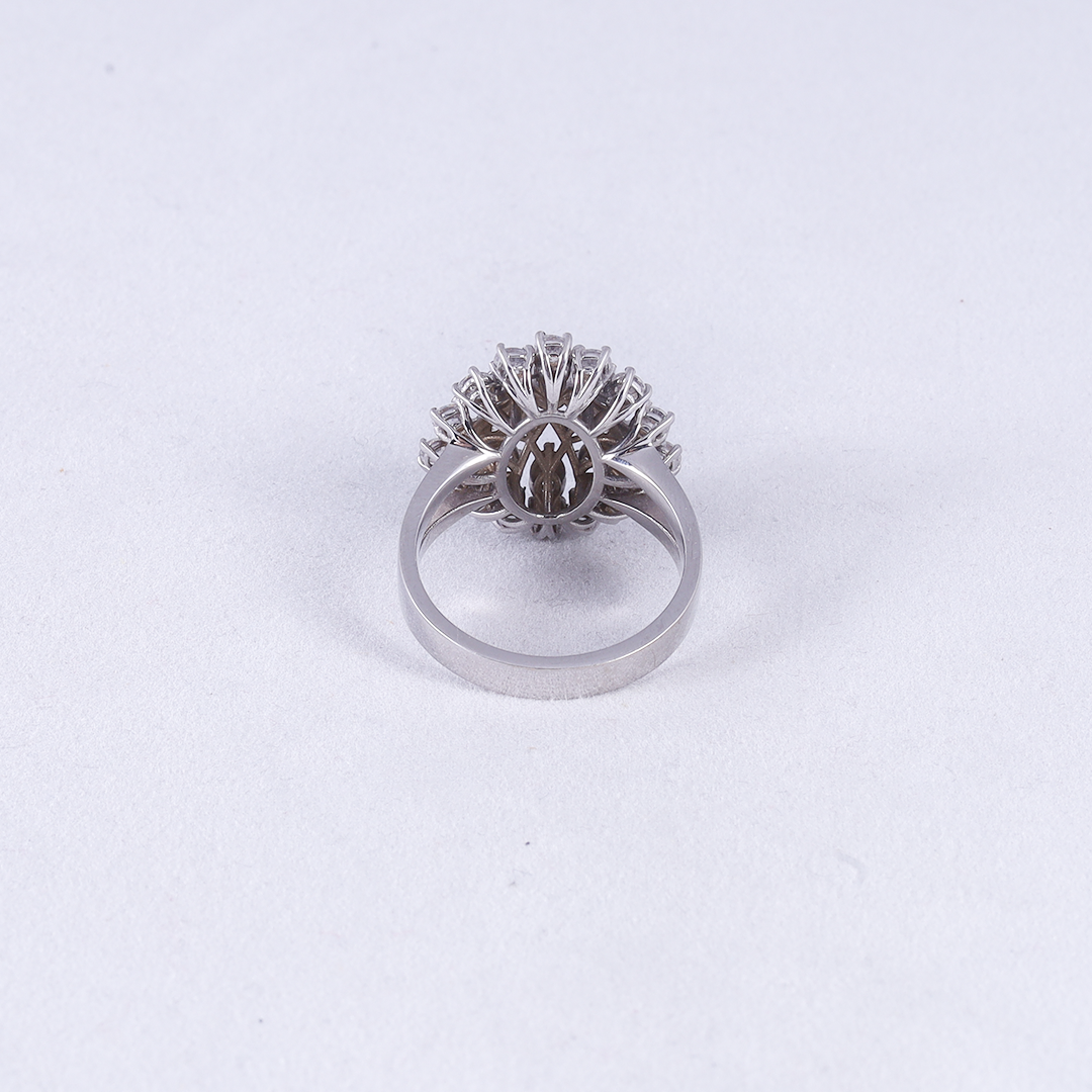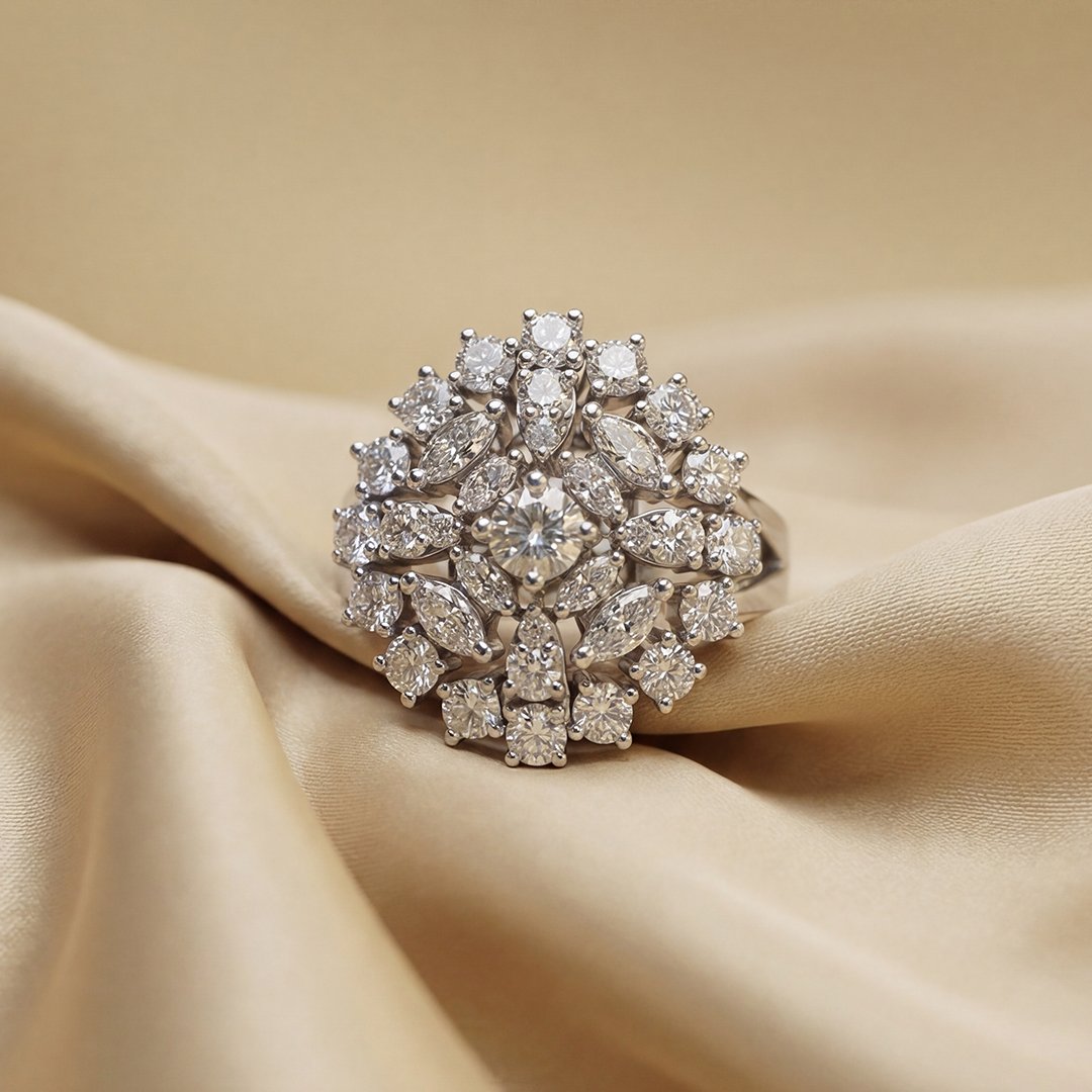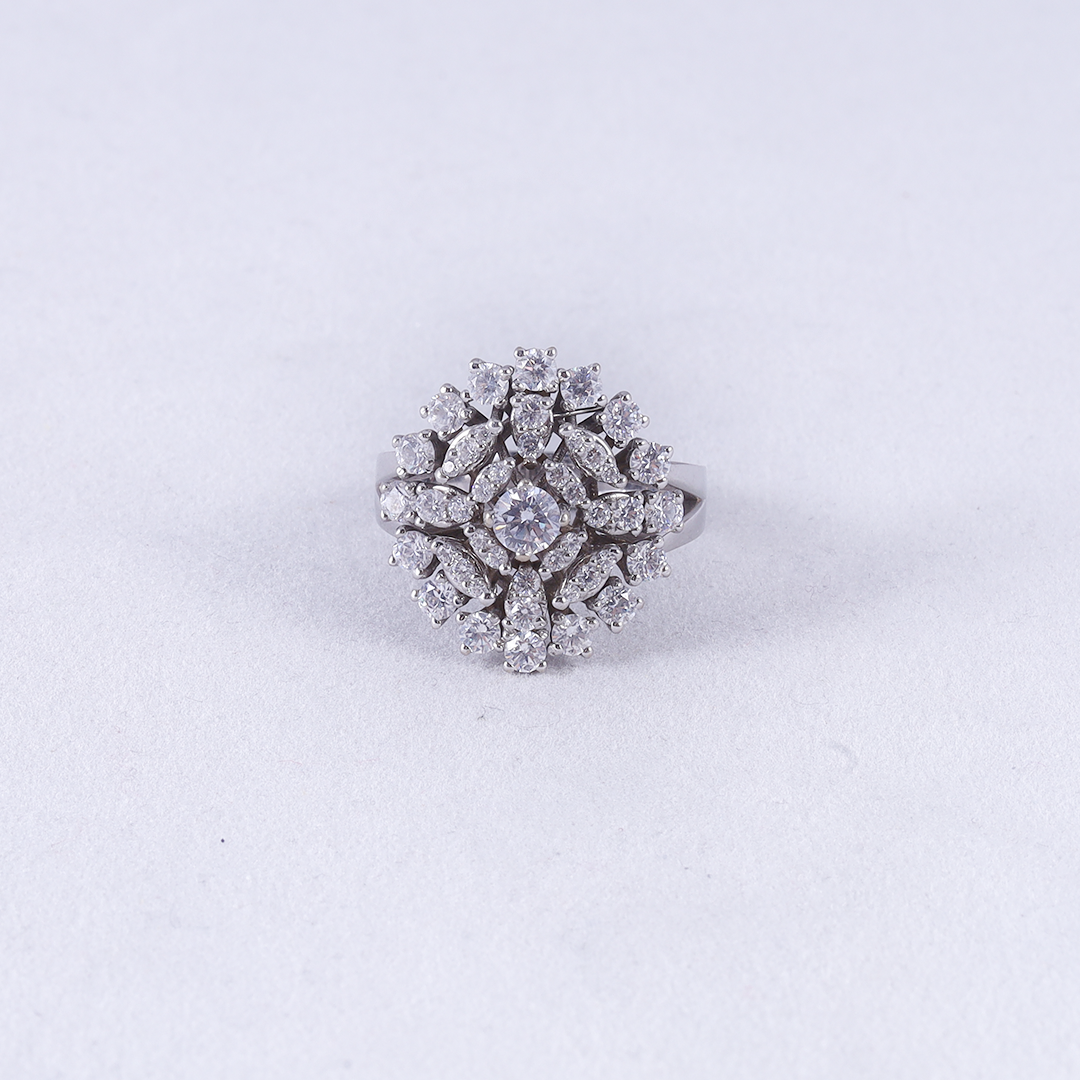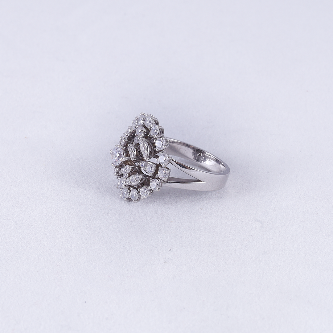 This radiant cocktail ring showcases a dense, multi-layered cluster of brilliant round-cut zircon arranged in a high-profile “snowball” silhouette for maximum brilliance and luxury.