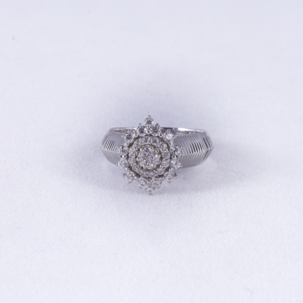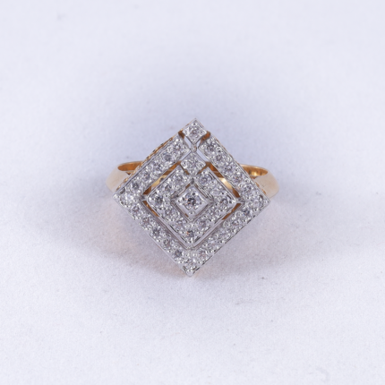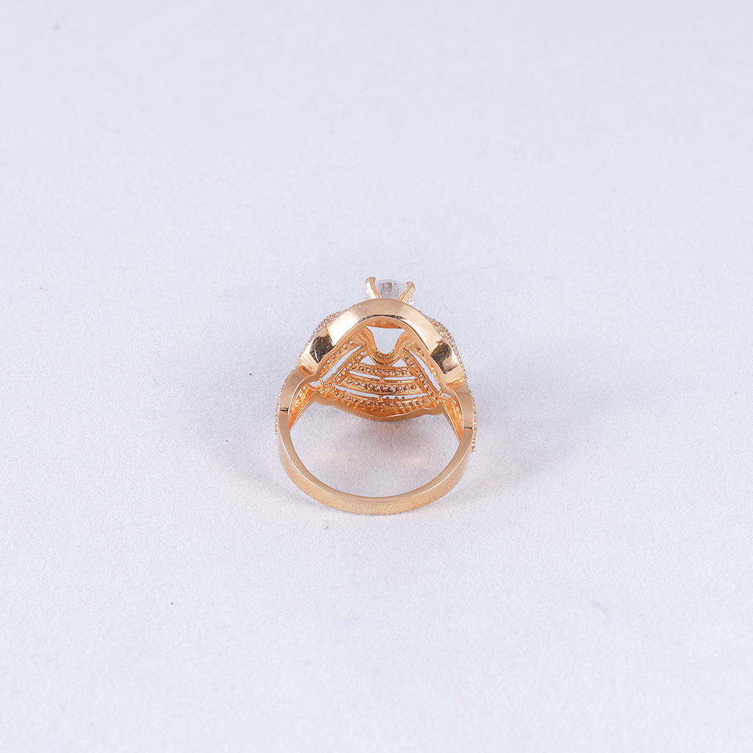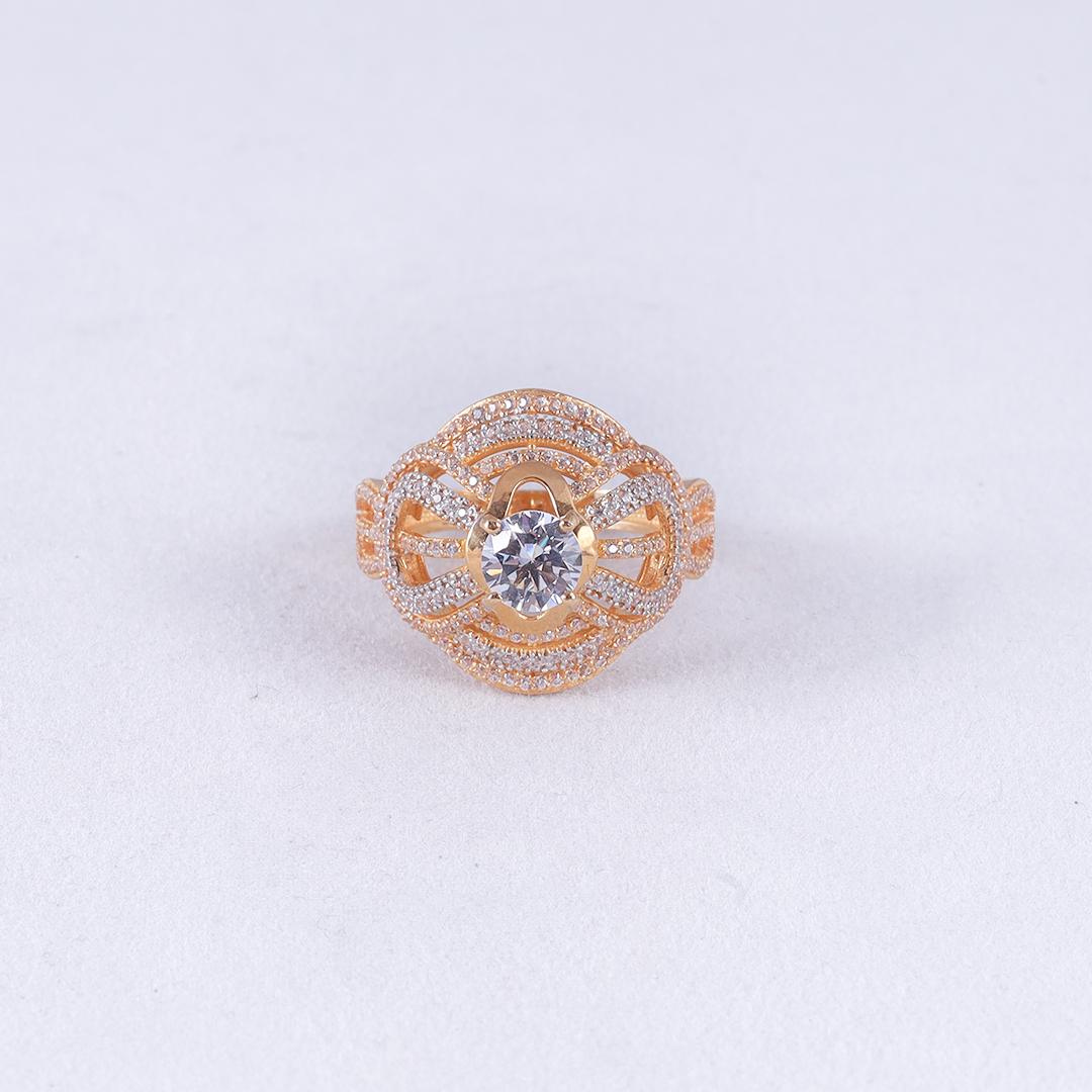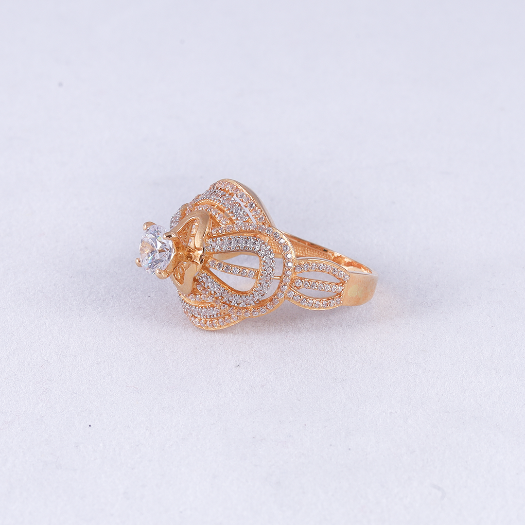 An intricate gold band featuring delicate open-work filigree and pavé accents curves upward to highlight a brilliant, raised round-cut zircon at its center.