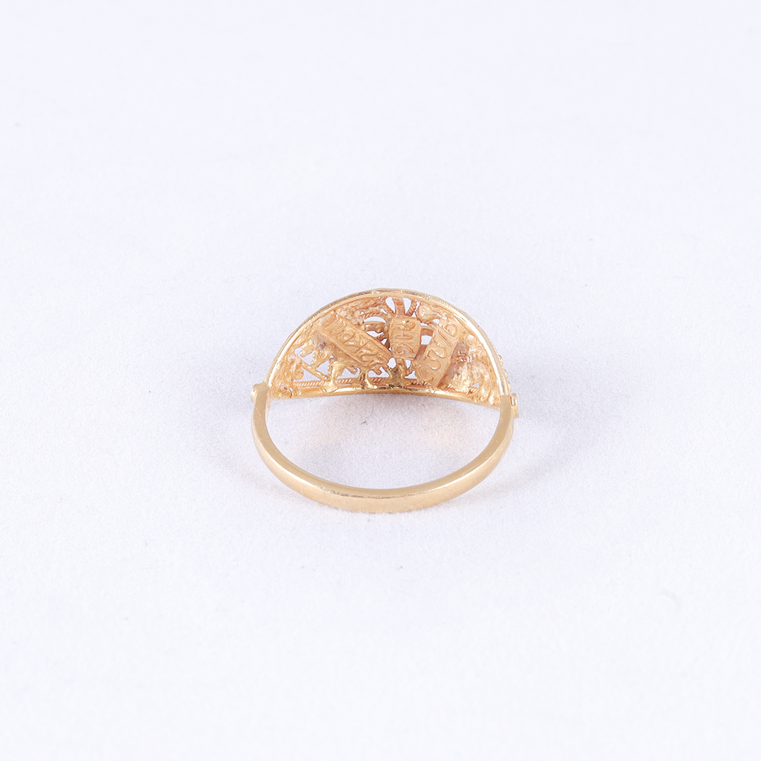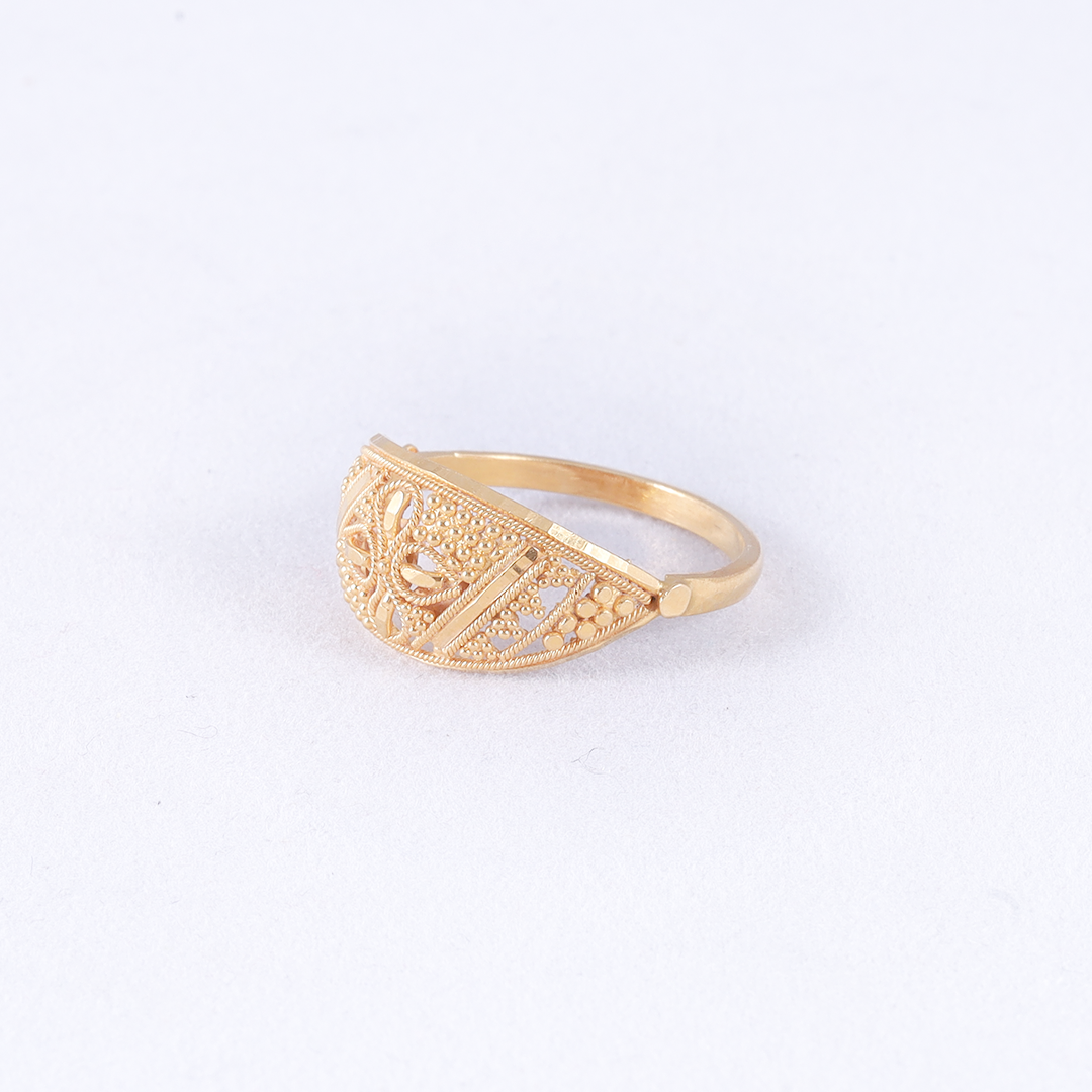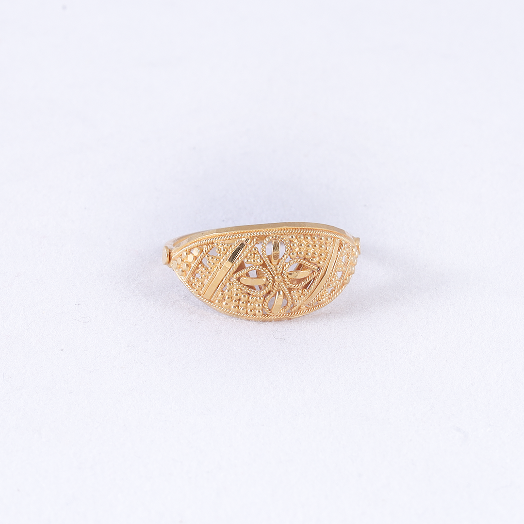 The design showcases traditional granulation and textured metalwork for a vintage aesthetic.It has a wide, crescent-style front that tapers into a smooth, high-polish band.The reflective gold finish gives it a rich, ornate look suitable for formal occasions.