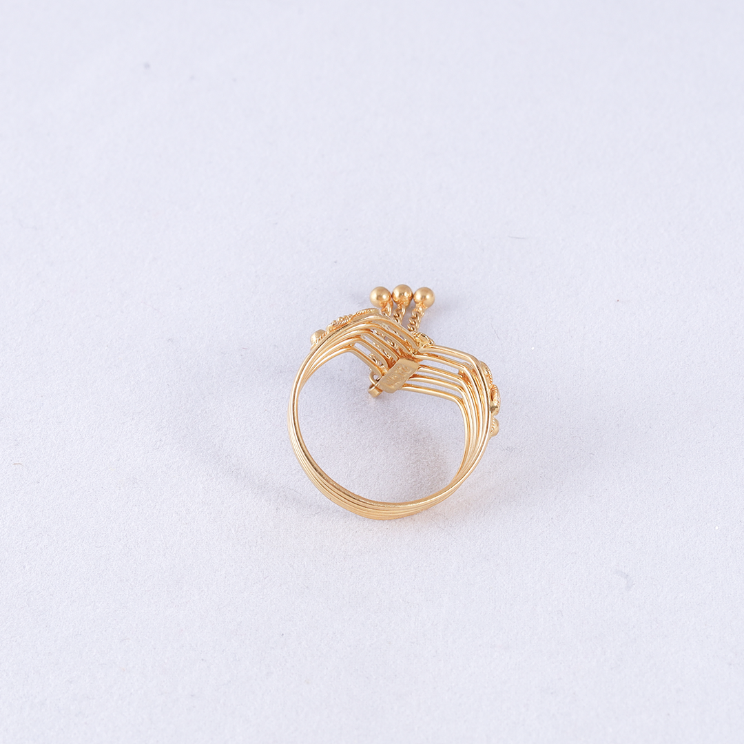 This unique gold ring consists of multiple parallel bands forming a V-shape, accented by small floral motifs and a dangling triple-chain tassel.