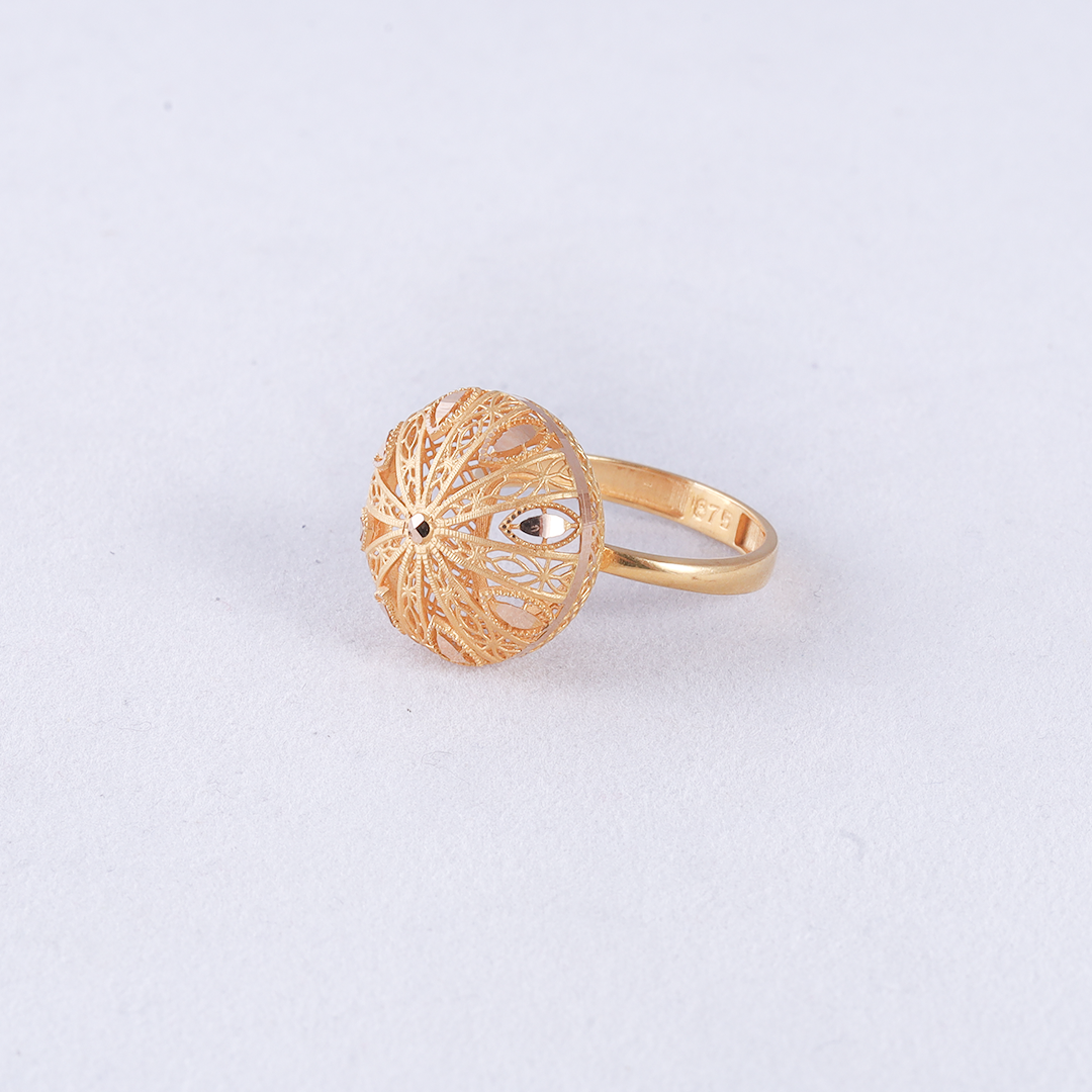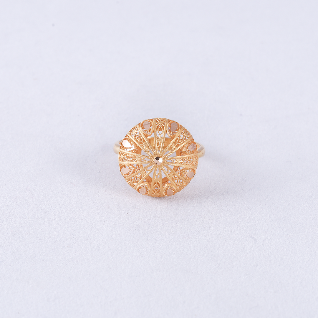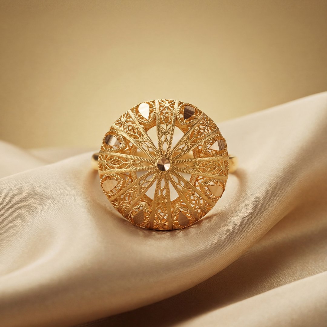 This circular yellow gold ring displays a highly detailed radial filigree design with delicate golden latticework and a central starburst motif.