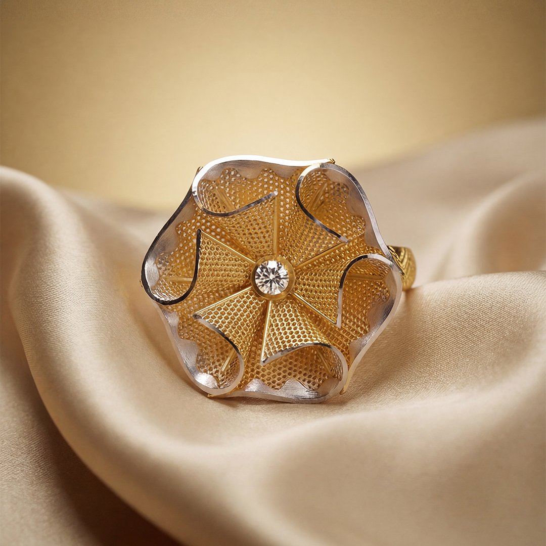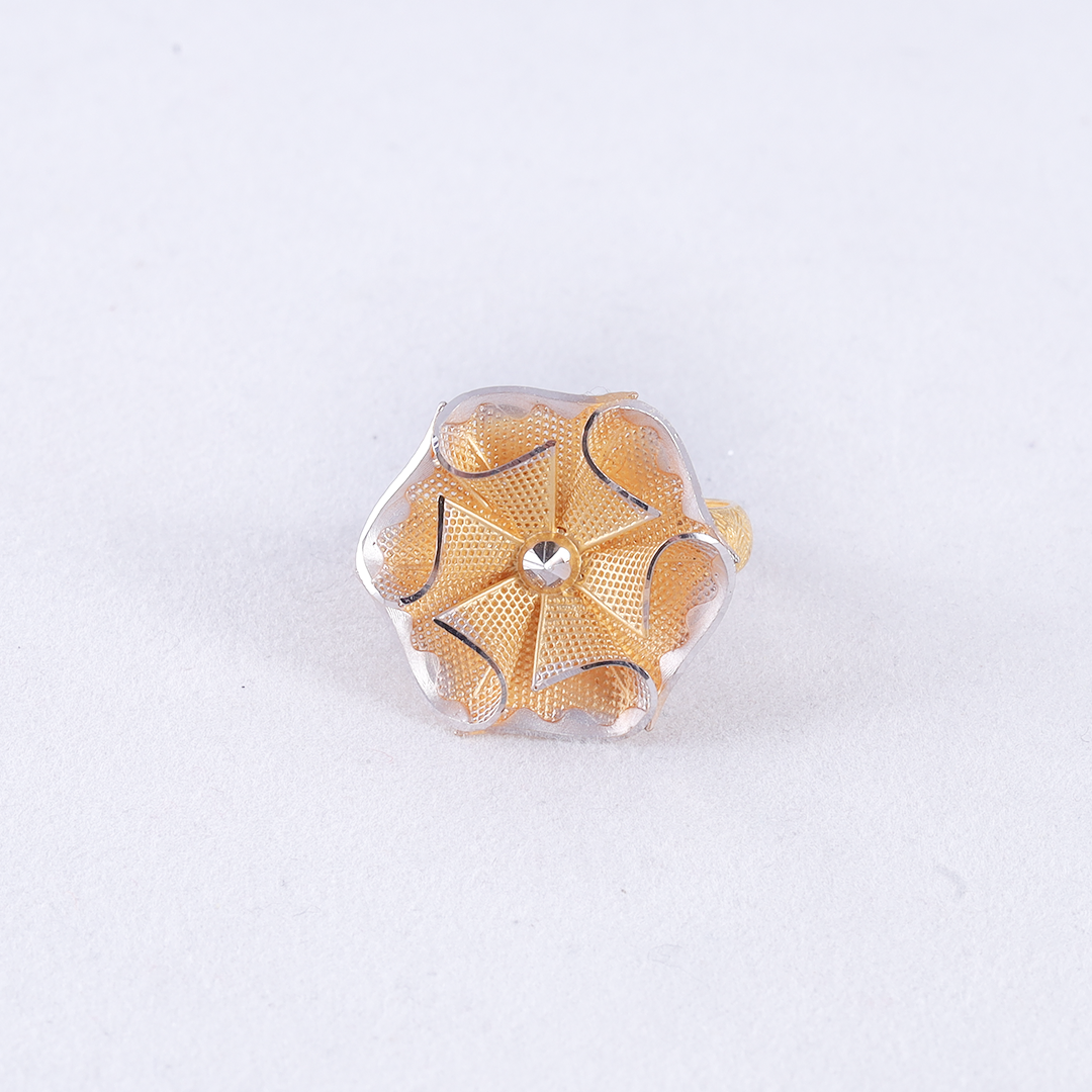 This yellow gold ring features a bold, scalloped-edge floral design with textured petals and contrasting silver-toned accents for a two-toned look.
