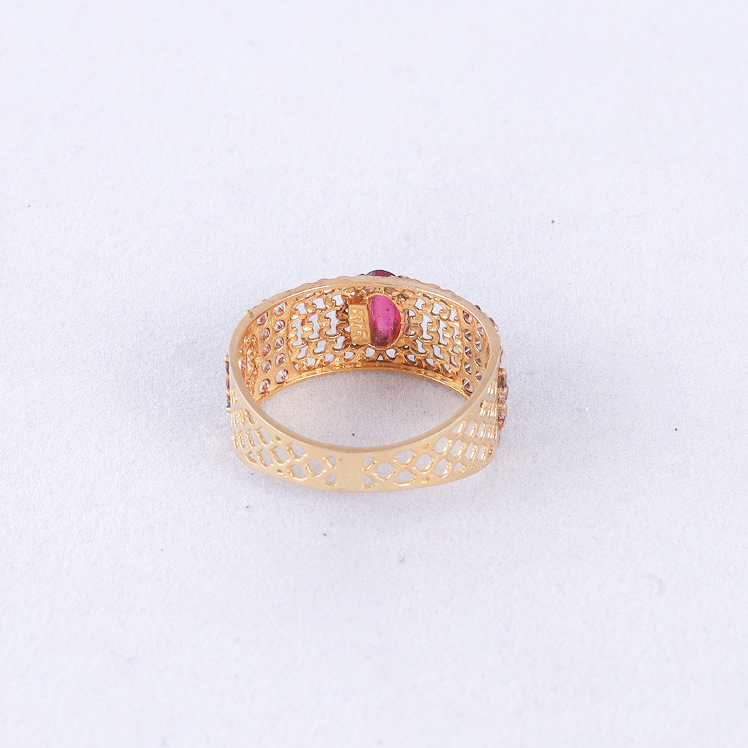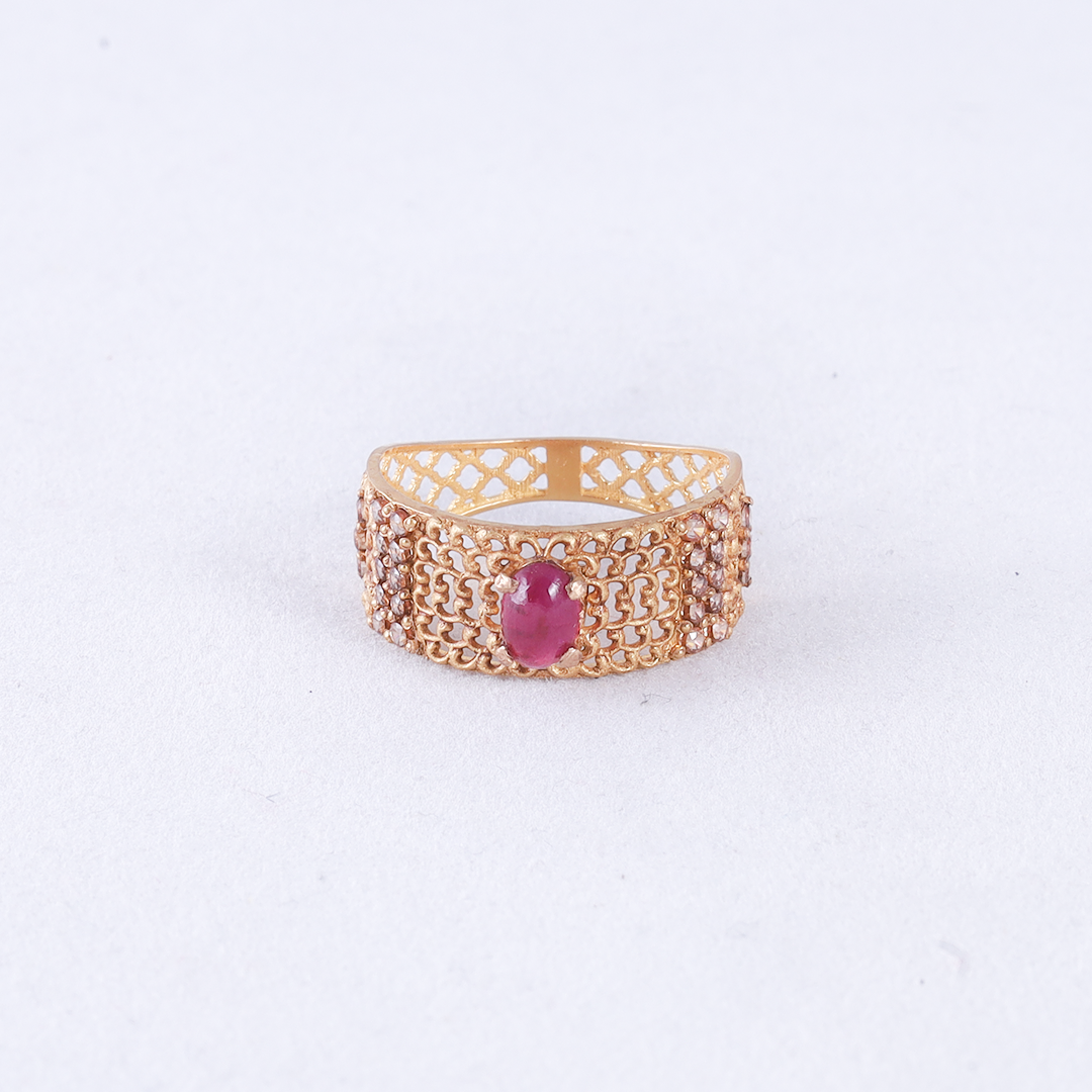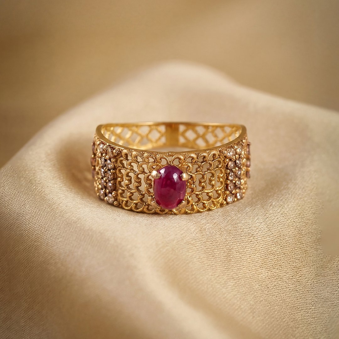 This gold band features a wide, openwork filigree pattern throughout the circumference and is highlighted by a single, oval-cut red gemstone at the center.