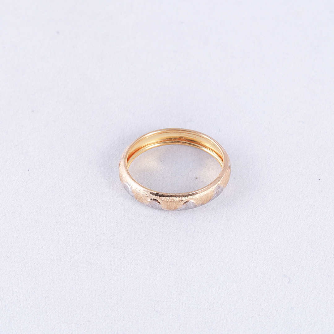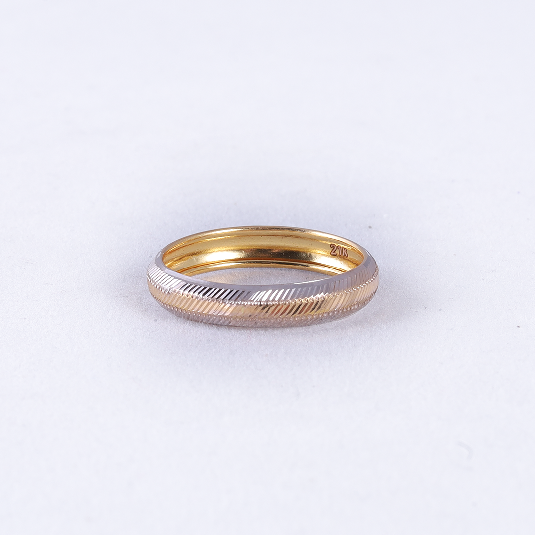 This classic two-toned band features a brushed silver-toned exterior with engraved crescent patterns and a smooth yellow gold interior.