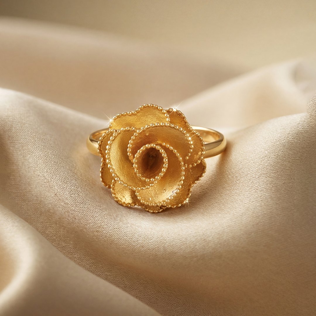This delicate yellow gold ring features a centerpiece shaped like a blooming rose with layered, bead-edged petals for a realistic floral effect.
