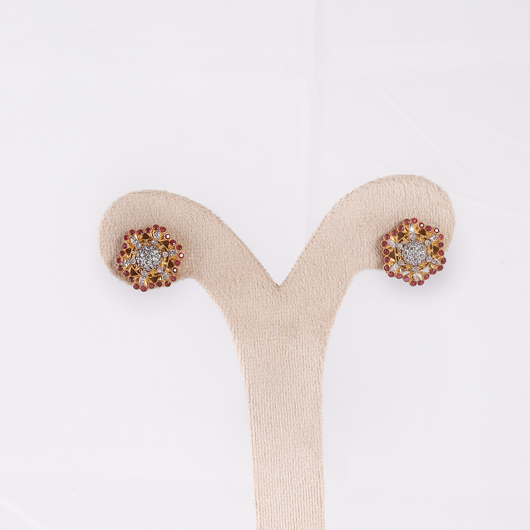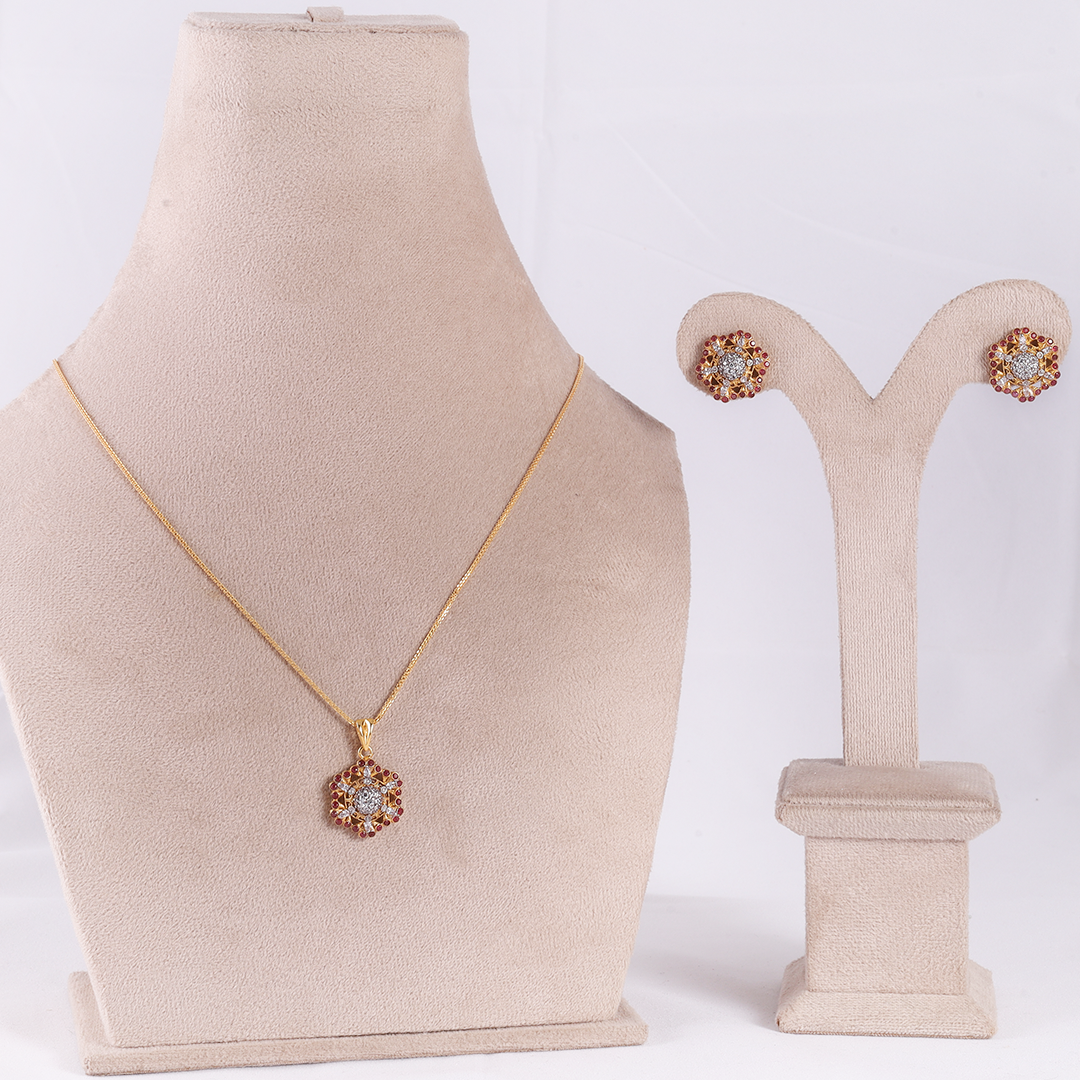 A hexagonal “sunburst” locket featuring a cluster of white zircons at the center, surrounded by a halo of deep ruby-red stones.Matching circular stud earrings that repeat the ruby and white zircon pattern.A bolder, more colorful set designed for a striking look.