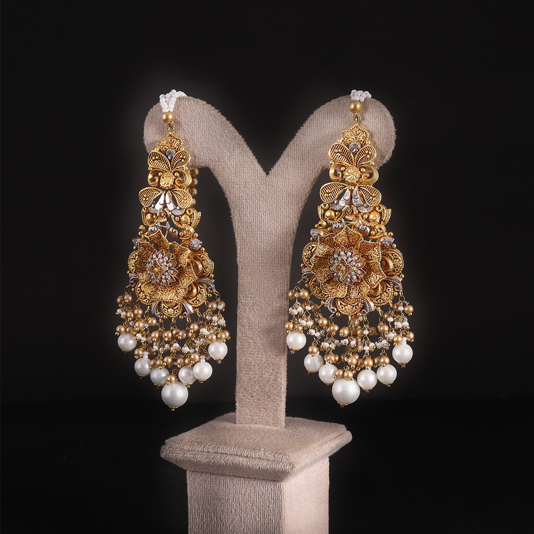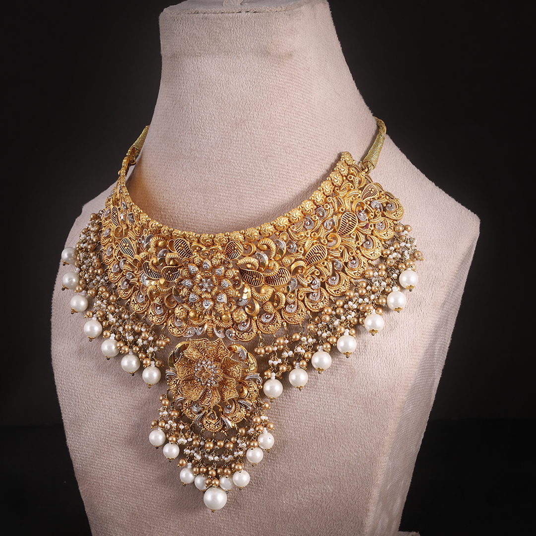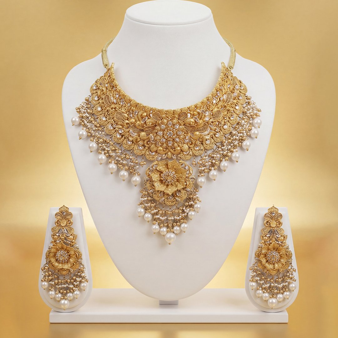 A wide, ornate collar featuring high-relief floral gold work and a large central flower pendant.The piece is heavily embellished with white pearls of varying sizes, which hang as a delicate fringe along the entire bottom edge of the collar and pendant.The earrings are long, statement drops with floral tops, finished with a dense cluster of pearls and gold beads at the base.