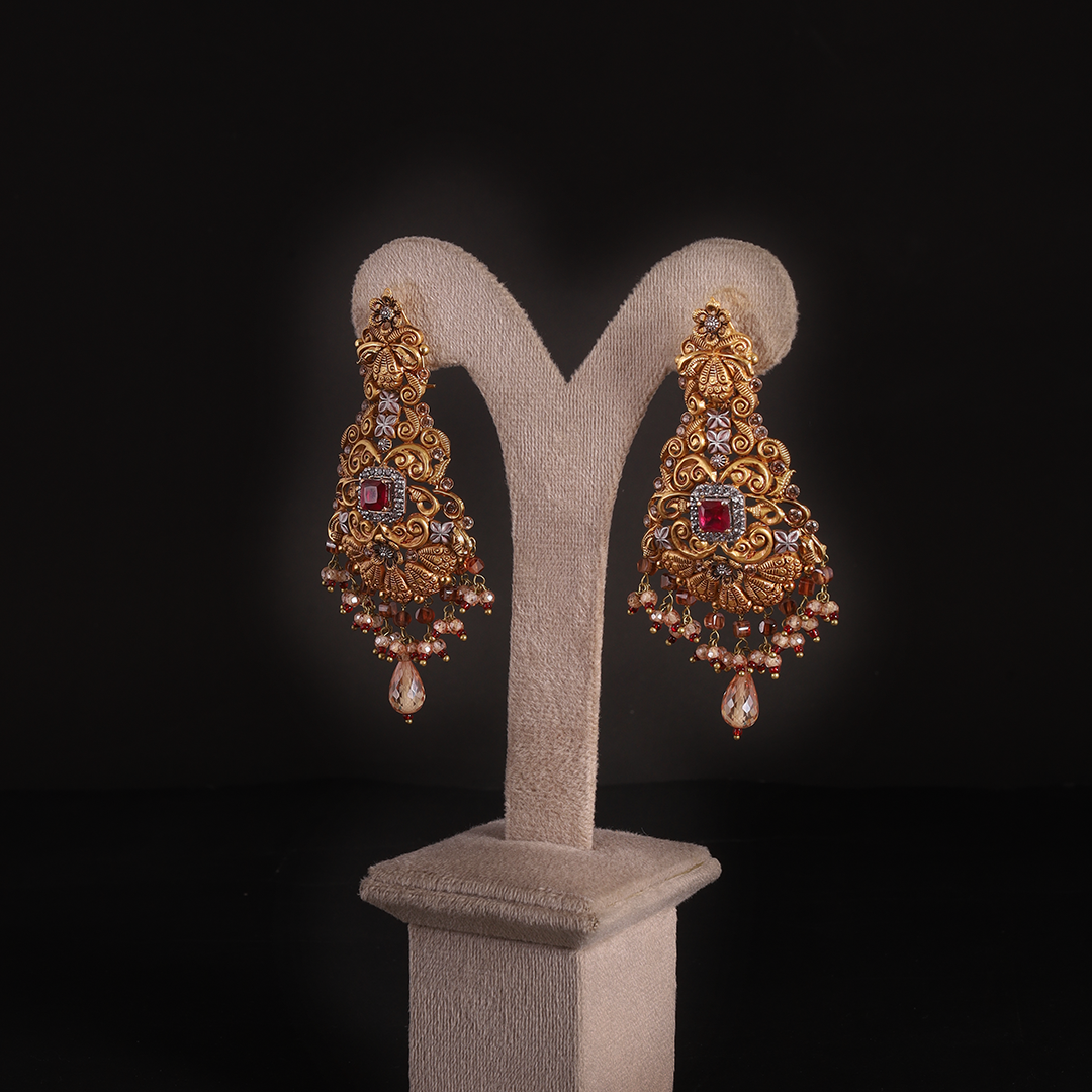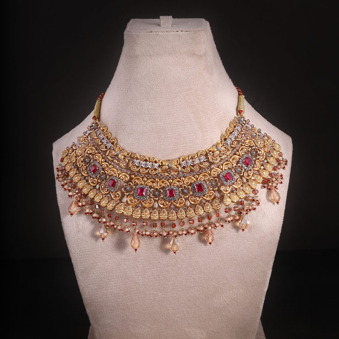 A wide gold collar set with a row of square-cut ruby stones, each surrounded by a diamond-shaped border of silver-toned stones.The necklace features a delicate fringe of amber-toned faceted beads and tiny maroon droplets.Long, ornate drops that mirror the square-cut ruby and filigree patterns of the necklace.