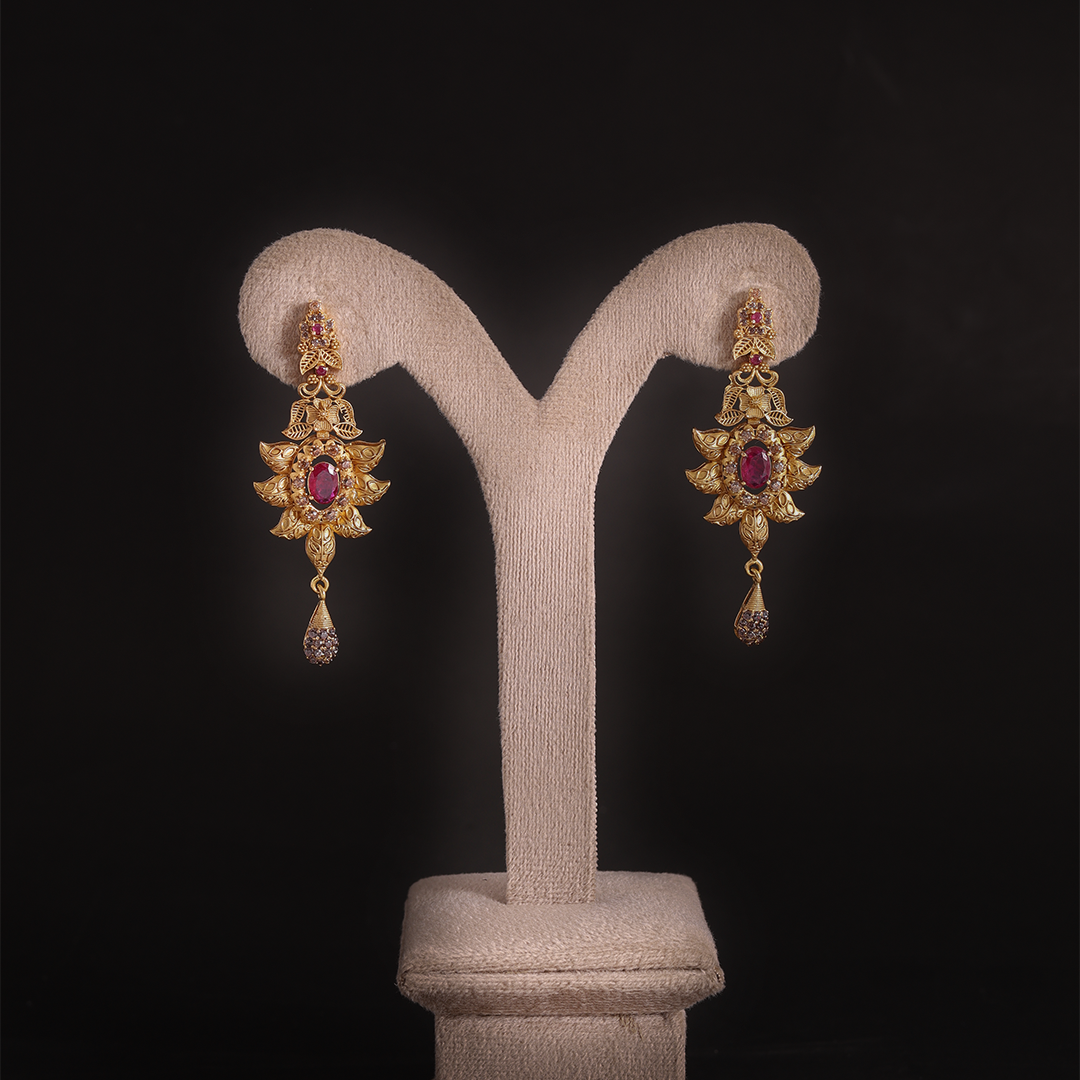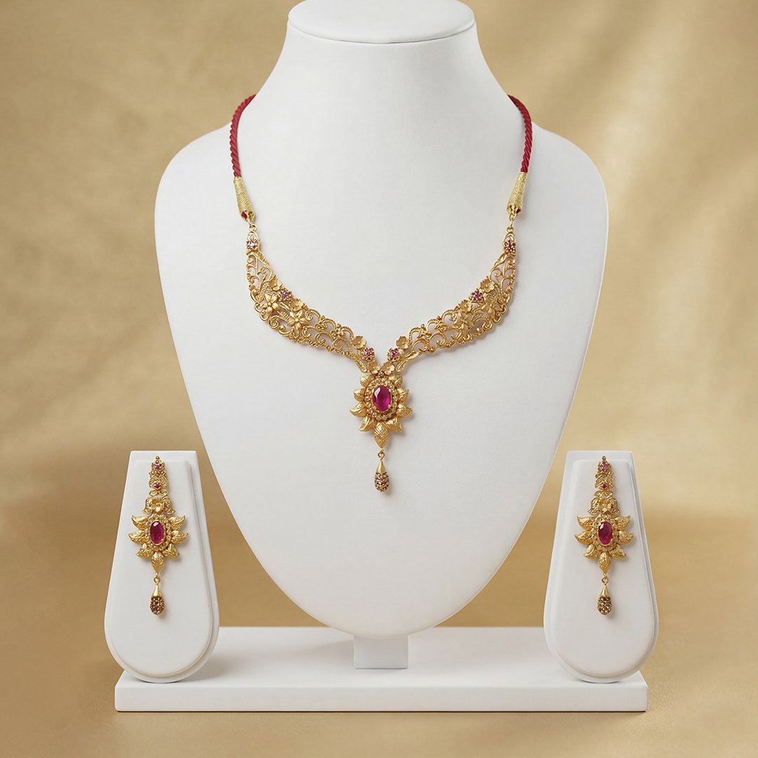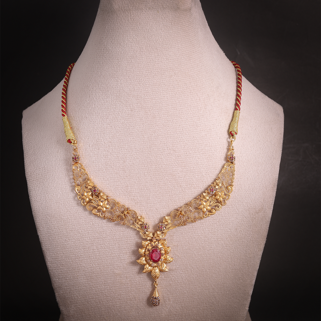 The necklace features an intricate, open-work filigree pattern in gold with a central floral-style pendant.Set with vibrant oval-cut red rubies in the center of the pendant and earrings.It is held by a traditional red and gold dori (adjustable cord) with a tassel finish.Matching drop earrings that mirror the floral filigree and ruby design of the main pendant.