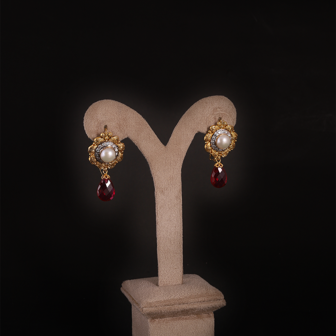 A thick, crescent-style choker necklace and matching floral stud earrings.Crafted with heavy mesh-textured gold work and layered gold bead edging.Centered around a large focal pearl surrounded by crystals, finished with a ruby-red teardrop stone.
