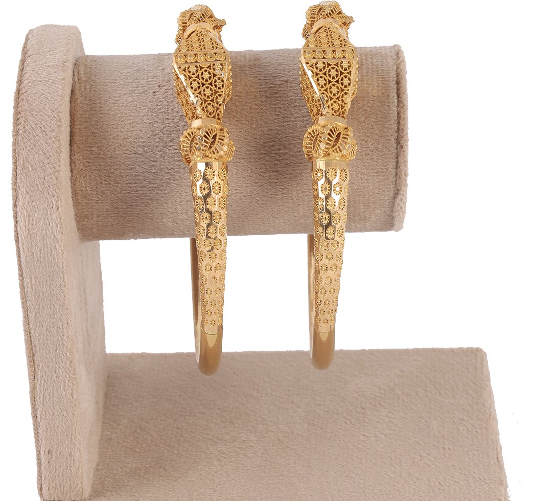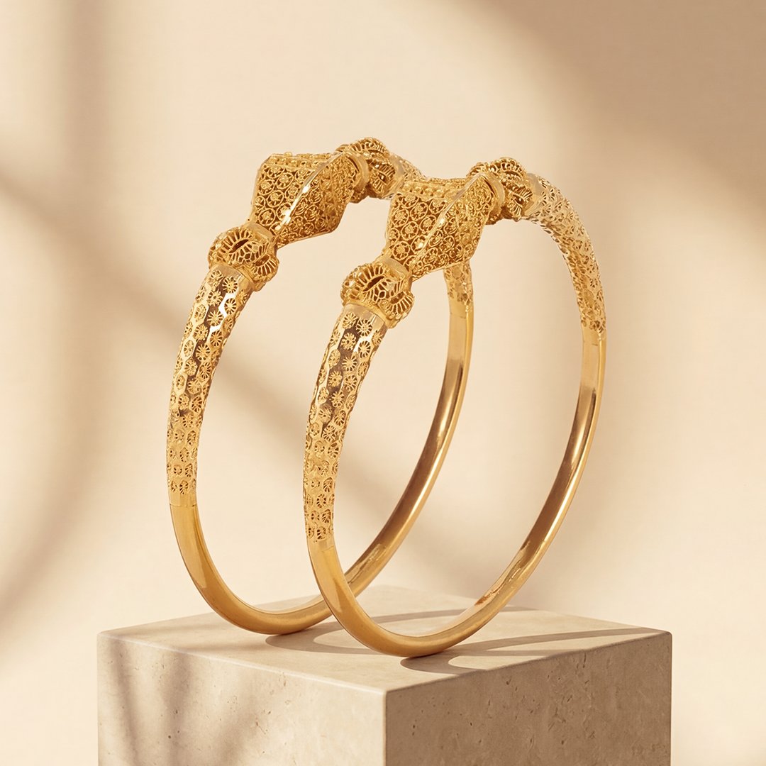 A pair of sleek gold karas featuring a geometric, diamond-shaped central motif with a fine granulated finish and elegantly textured bands.Sharp, angular focal point with a vertical divider and intricate “daana” (beading).