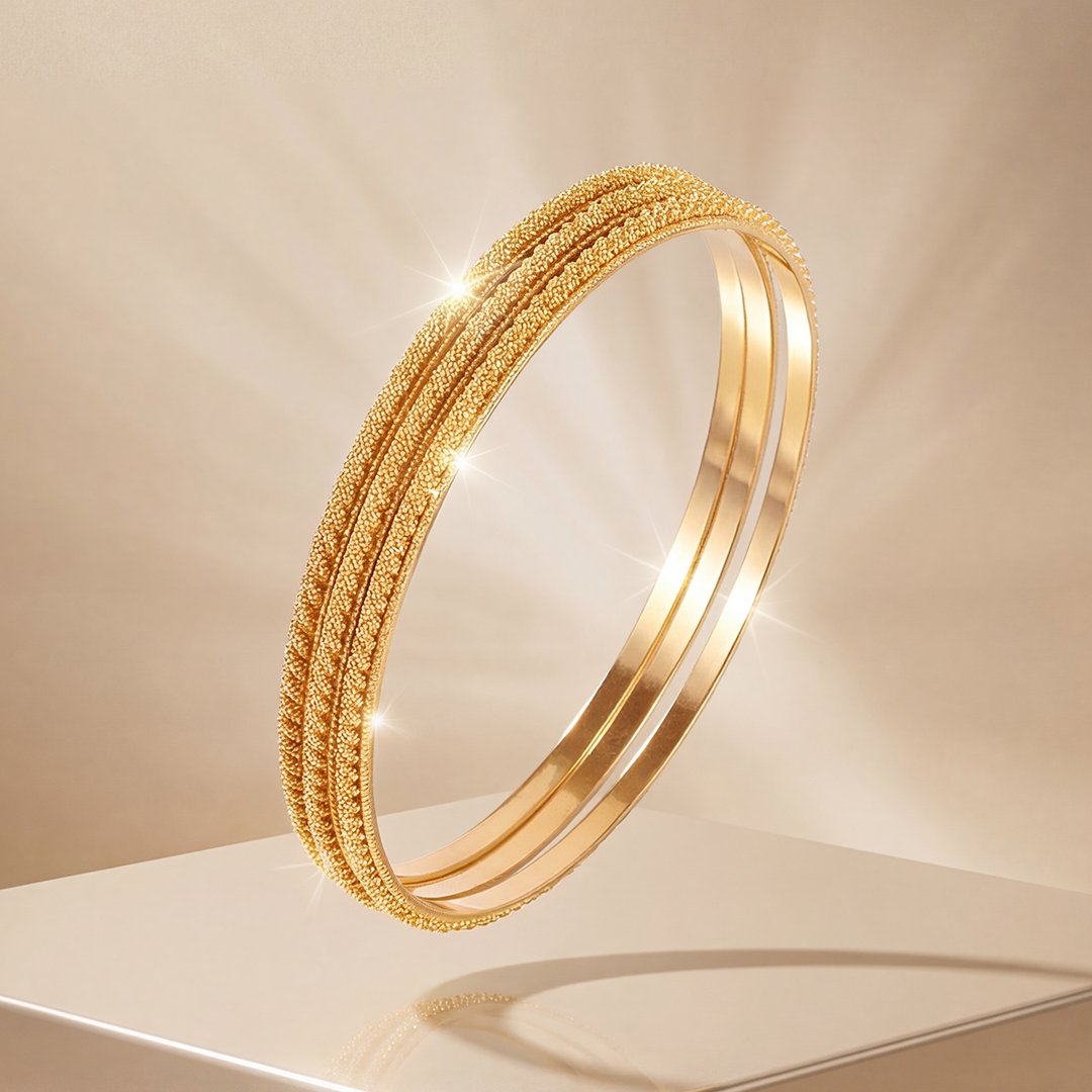 Exquisite triple-strand twisted gold bangle by Nafees Jewels, featuring a high-polish, textured rope design that captures a timeless vintage aesthetic. Handcrafted in premium 21K gold, this elegant piece offers a rich yellow luster and a sophisticated layered silhouette, making it a versatile statement for both traditional celebrations and modern luxury wear.