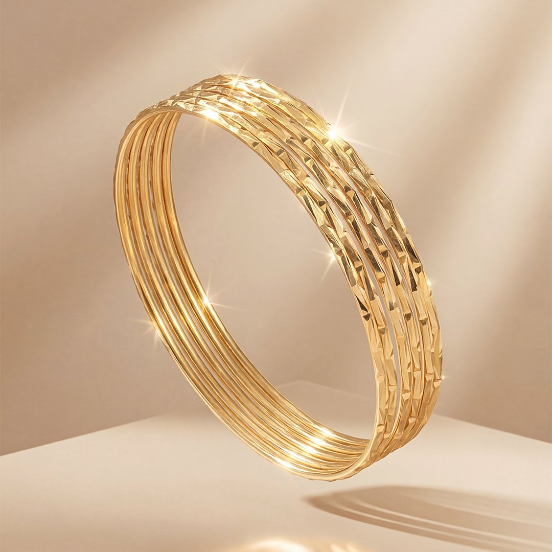 A contemporary set of six high-shine gold bangles that redefine modern luxury through sharp, angular artistry. These pieces are designed for maximum light reflection, featuring a unique “jagged” silhouette that breaks away from the traditional smooth bangle form.