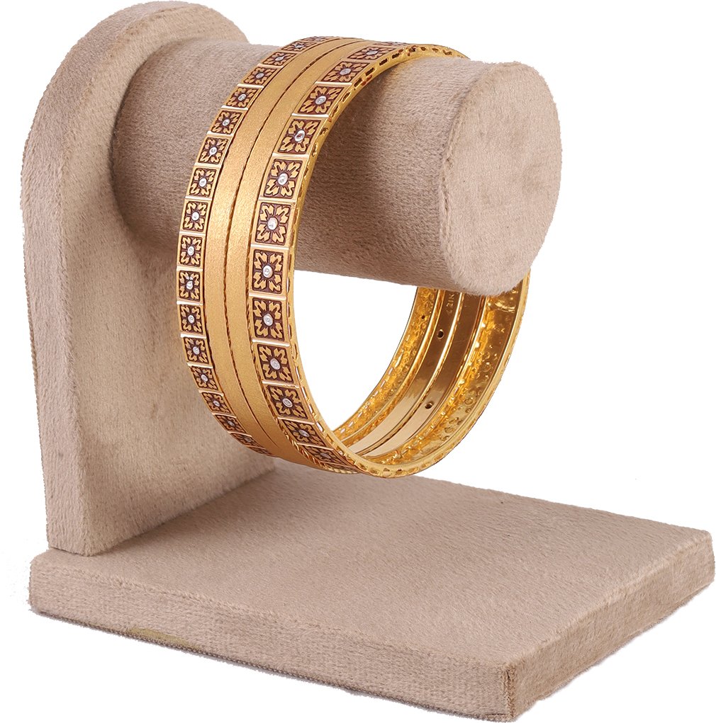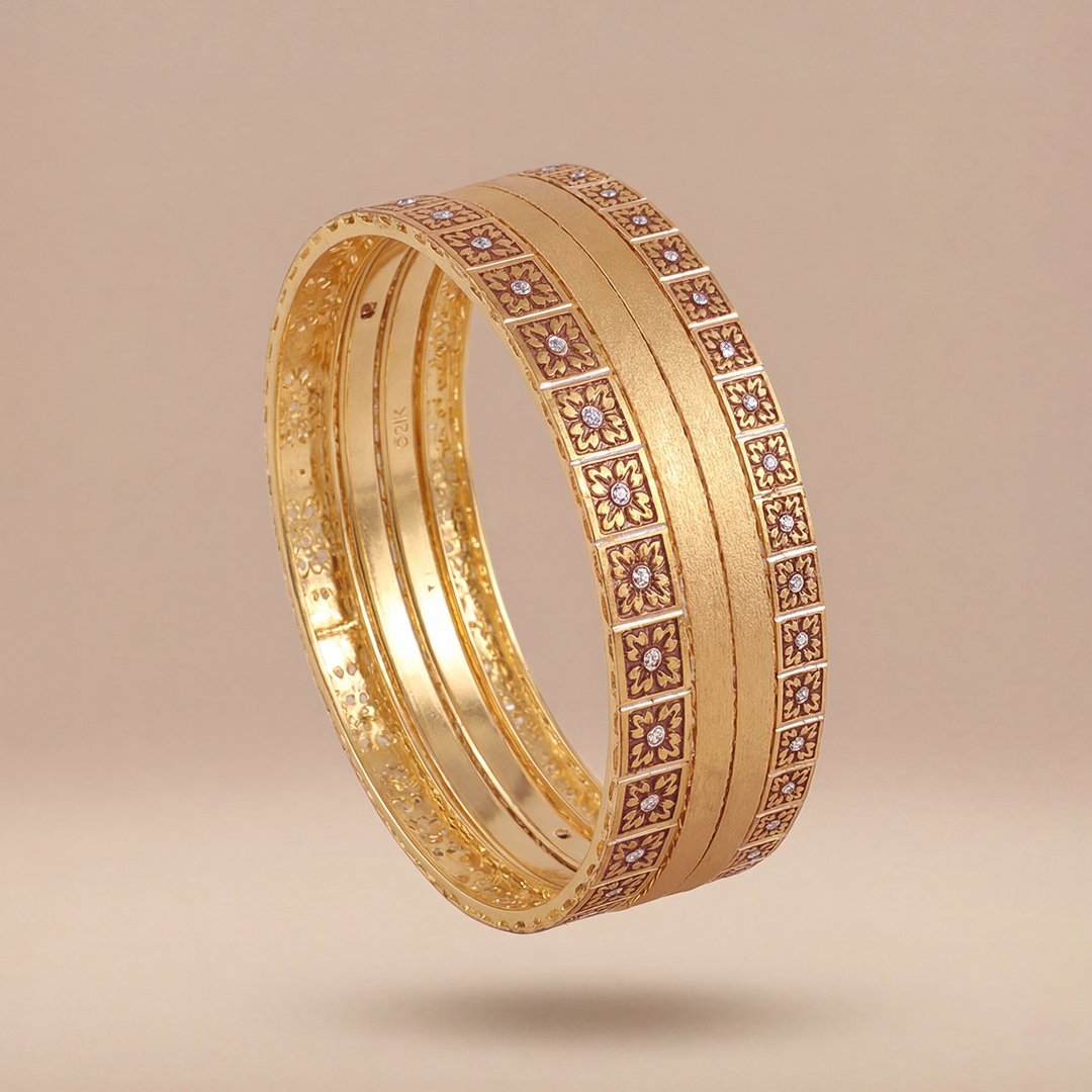 A stunning matte-finish 21K gold kara featuring a sophisticated central gallery of etched floral motifs. This handcrafted piece blends a modern brushed-gold aesthetic with traditional artisan engraving, creating a bold yet elegant statement of luxury.