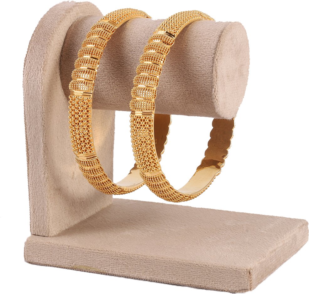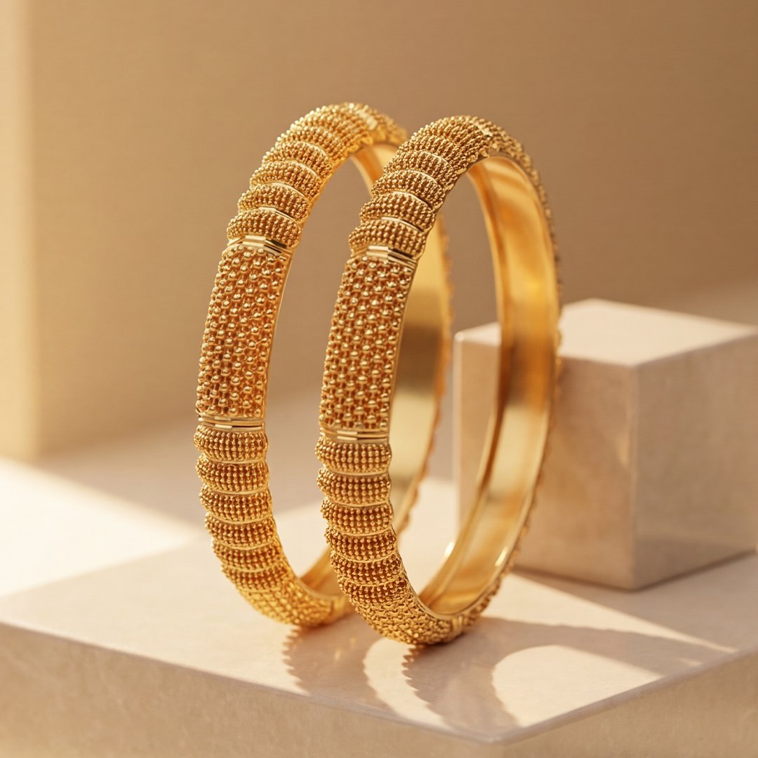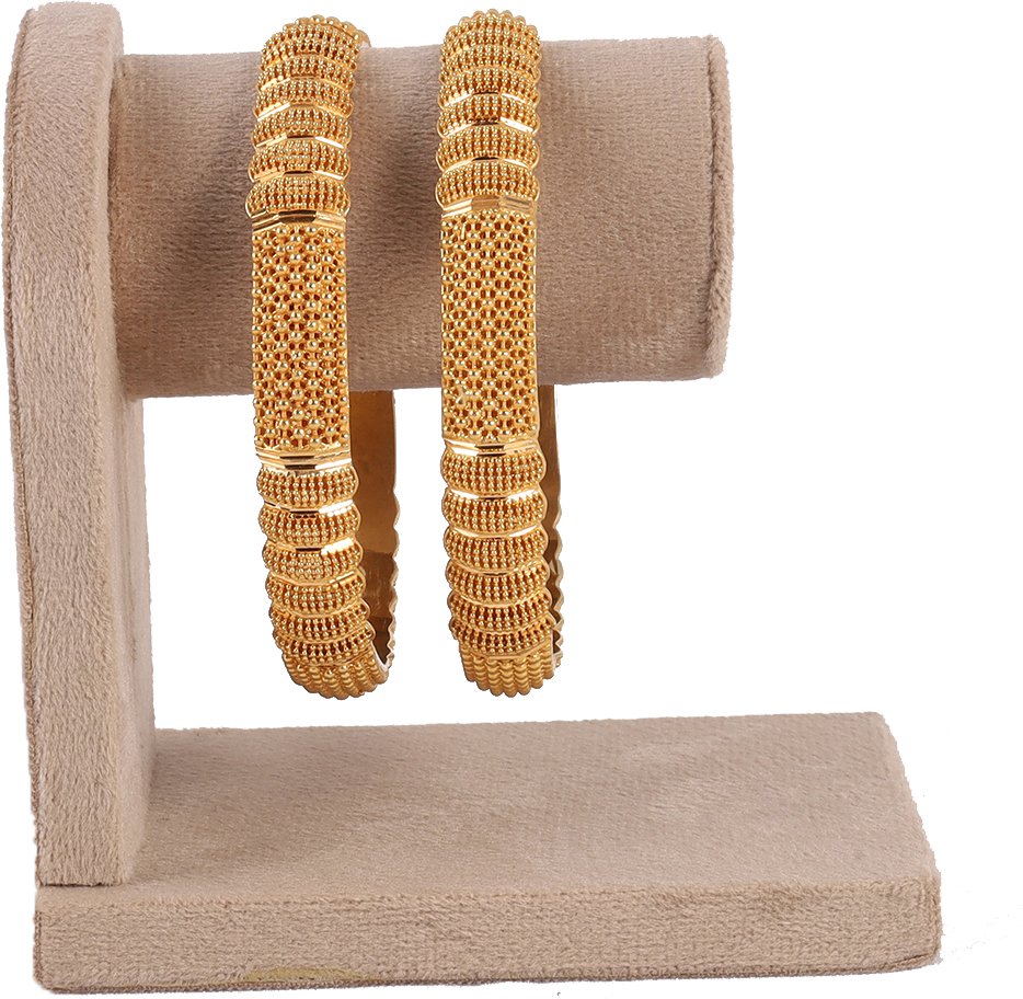 A pair of classic textured gold bangles featuring a rhythmic, multi-row beaded pattern and smooth vertical dividers for a structured look.A timeless, versatile design suitable for both daily wear and formal occasions.