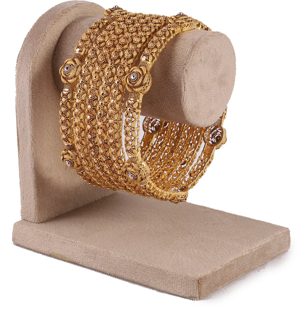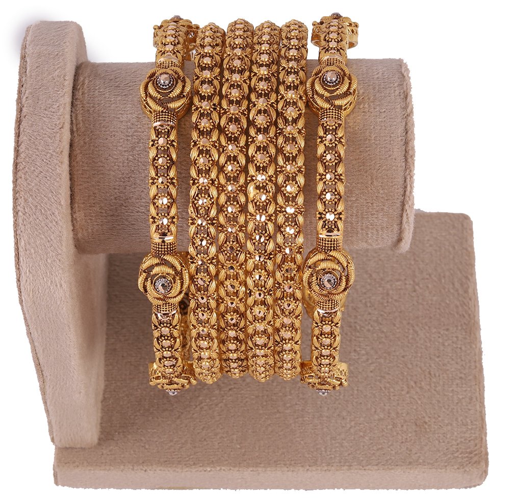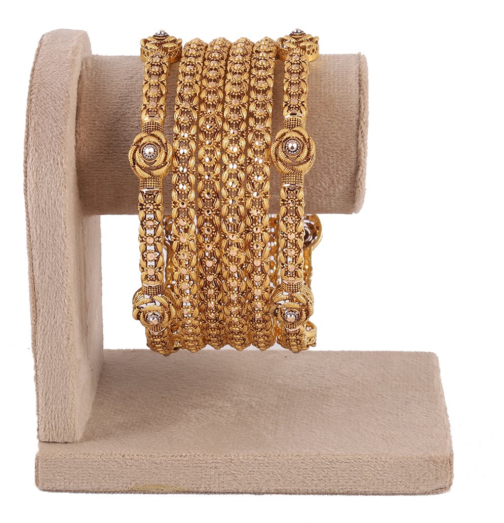 This stunning collection shifts toward a more romantic and traditional aesthetic, utilizing fine filigree and floral elements to create a look of timeless femininity.The two outer bangles are anchored by beautifully sculpted rose-shaped motifs, each finished with a tiny shimmering center that mimics the look of a dewdrop or a small stone.The inner bangles feature a repetitive floral-vine pattern, created through expert granulation and open-work filigree that gives the gold a soft, fabric-like appearance.