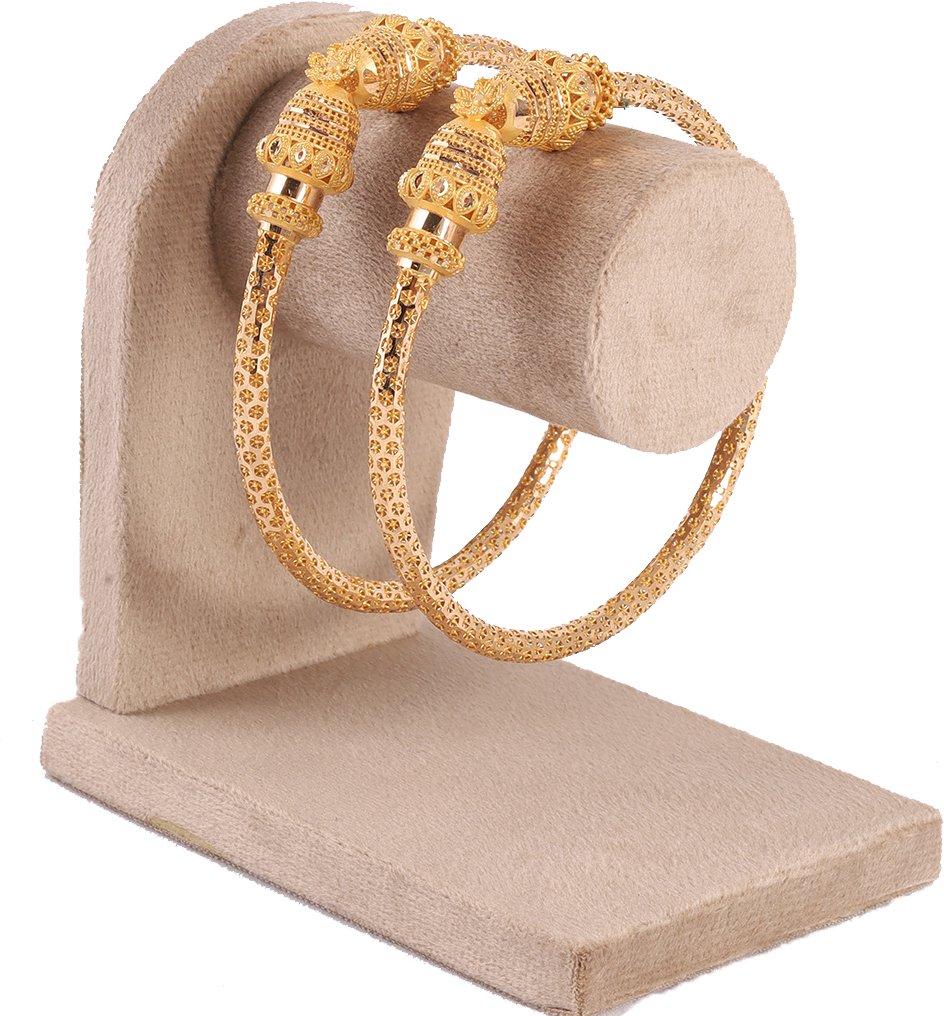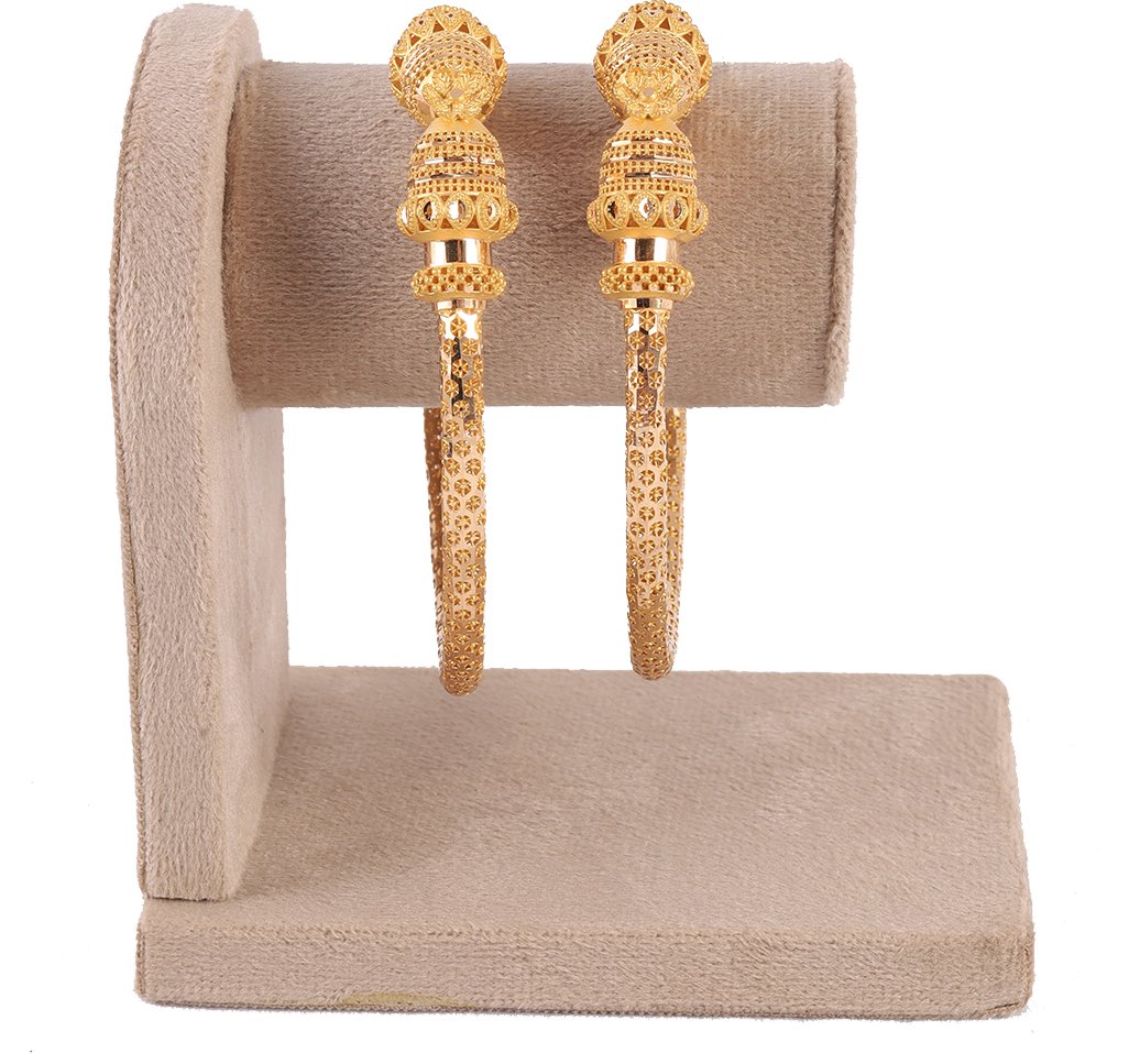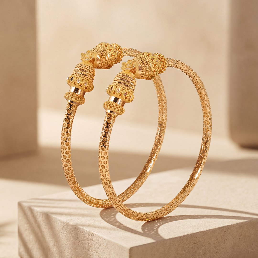 A pair of regal gold karas featuring a delicate floral center motif and tapered, ribbed textured bands.Heavily textured with a traditional “daana” (beaded) pattern.