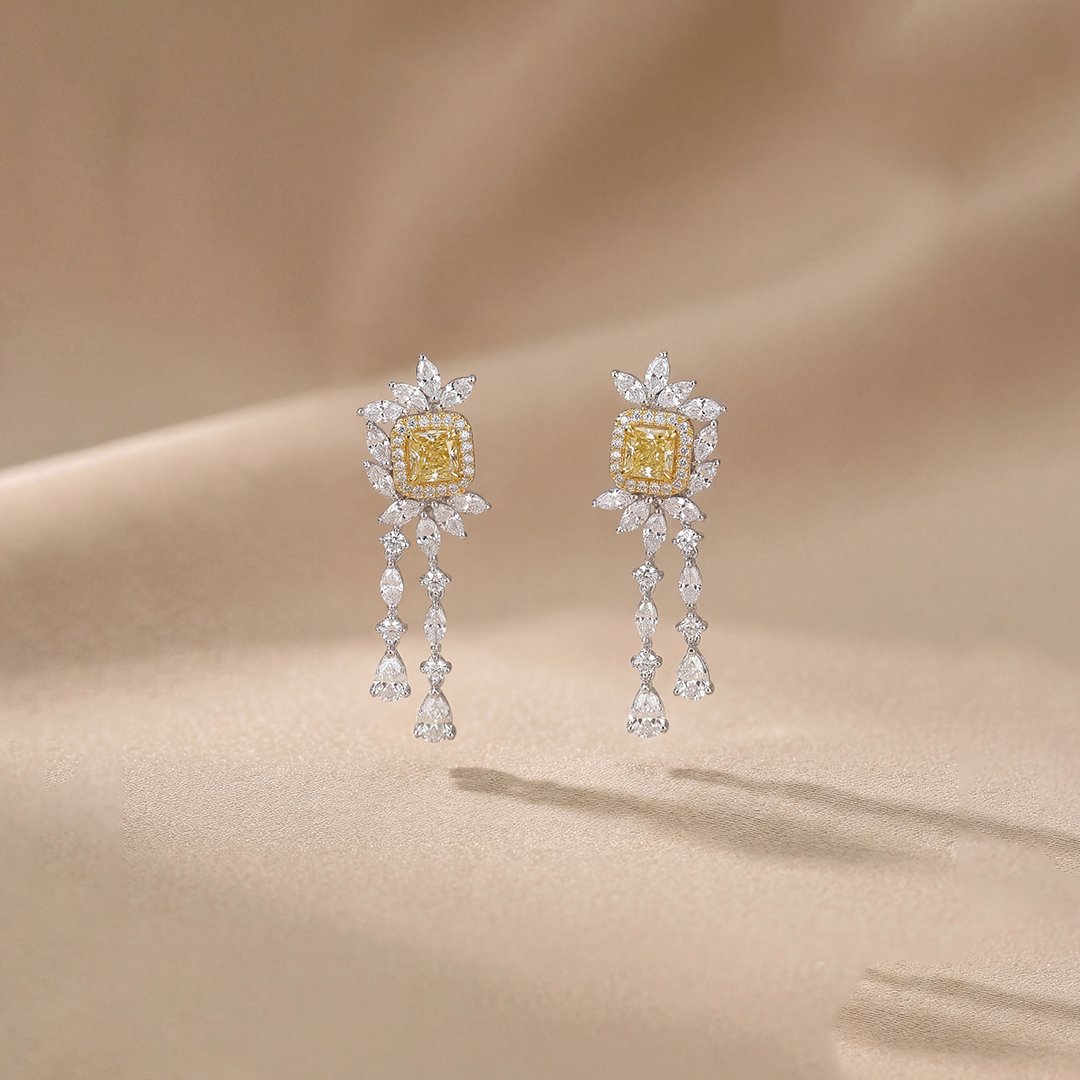 These exquisite drop earrings feature a vibrant yellow cushion-cut center stone encircled by a floral halo of shimmering marquise diamonds. Delicate, articulated strands of round and pear-shaped gems dangle below, creating a graceful waterfall effect that offers movement and high-wattage brilliance for a truly luxurious look.