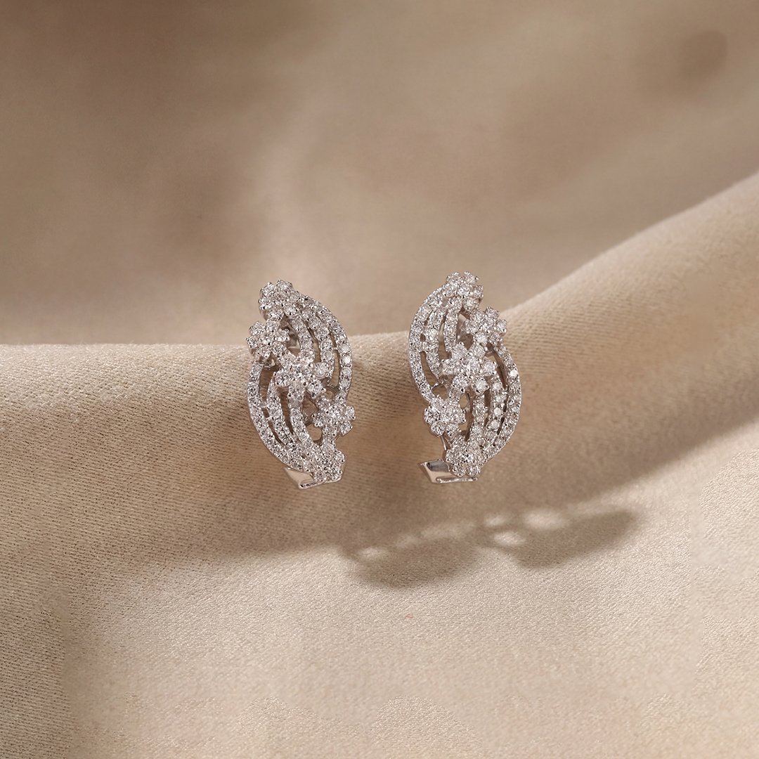 These elegant stud earrings feature a graceful swirling design, intricately pavé-set with shimmering round-cut stones. The fluid, wave-like curves are punctuated by delicate floral clusters, creating an organic yet sophisticated silhouette in a polished silver-toned finish that captures light from every angle for a dynamic and radiant look.